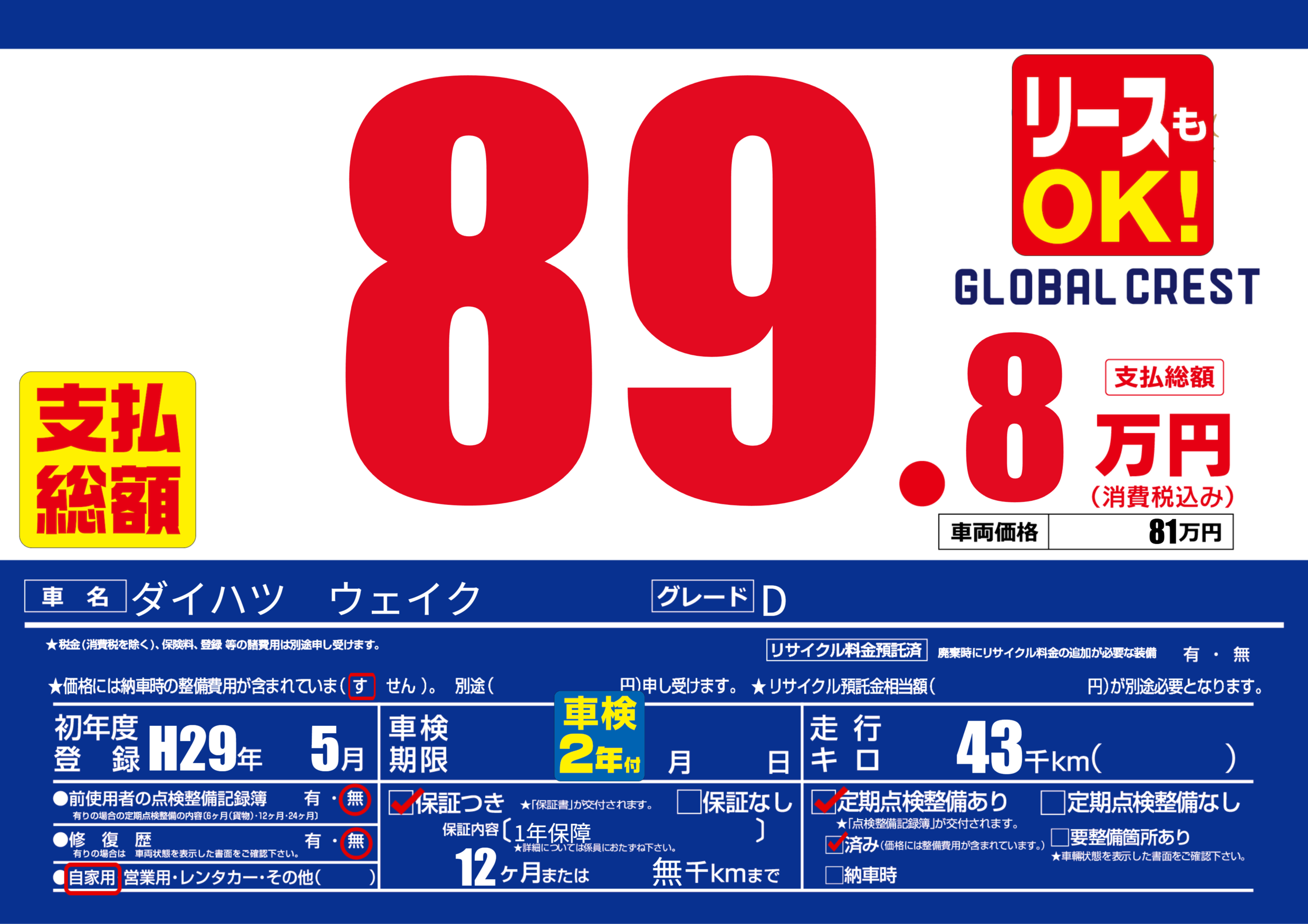| 定期点検整備 | 定期点検整備あり 定期点検整備済み | ||