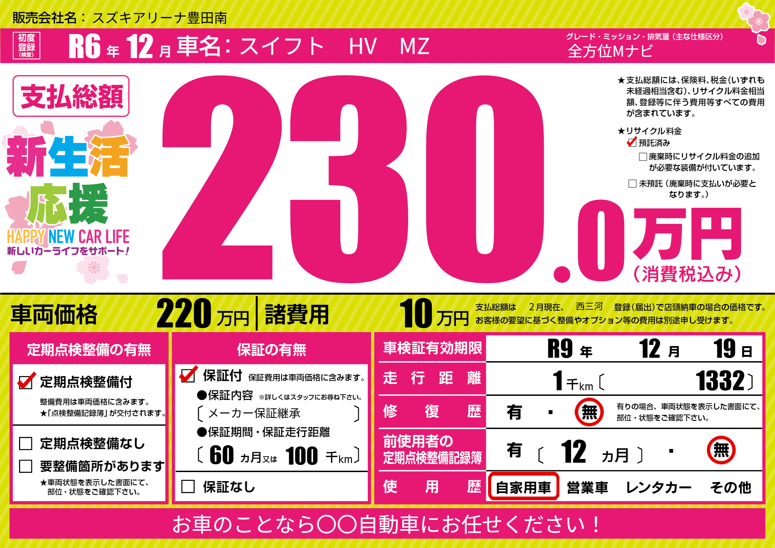 | 車名 | スイフト HV MZ | グレード ミッション 排気量 |