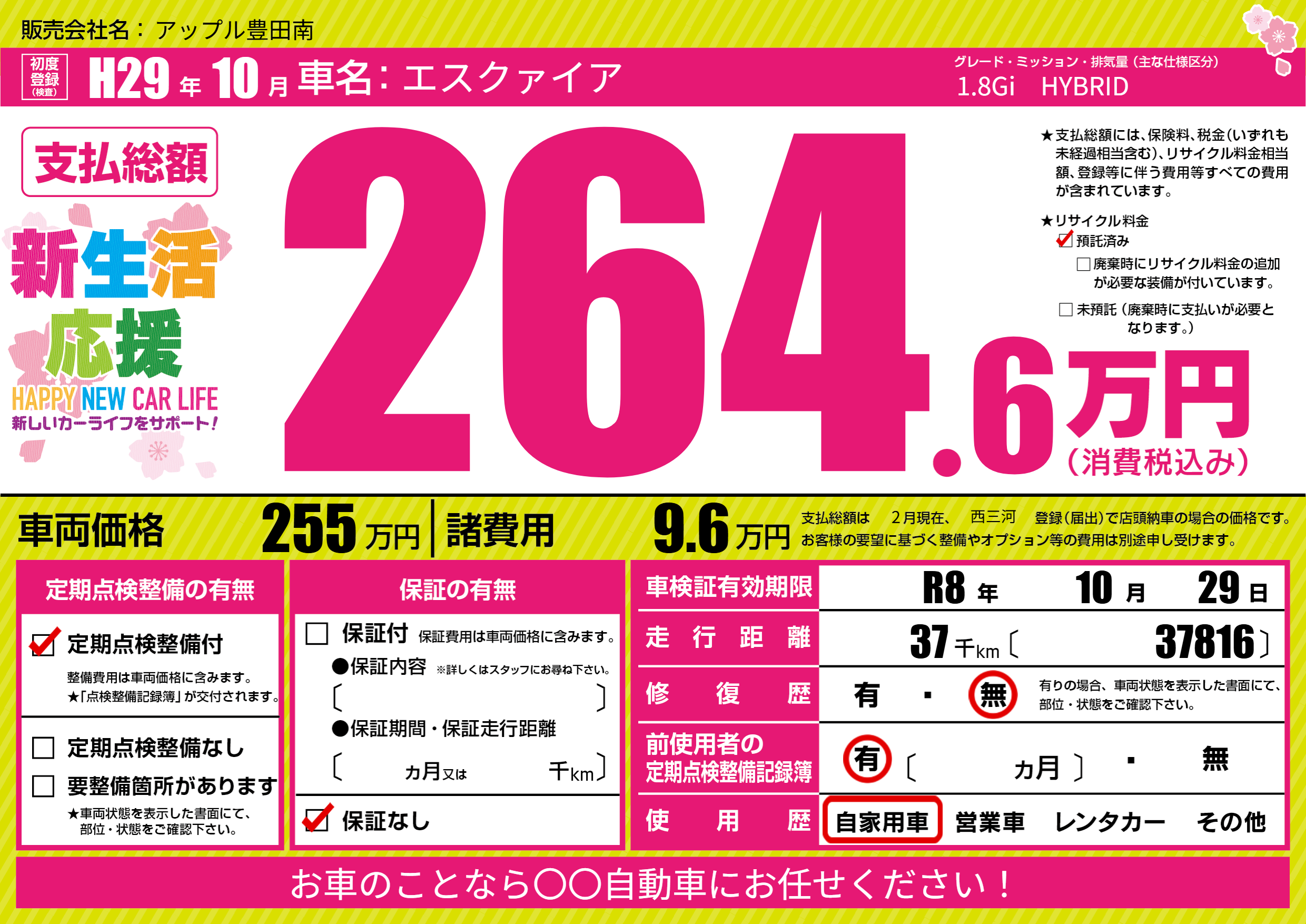 あり | リサイクル預託金相当額 | ( 0円)が別途必要 |