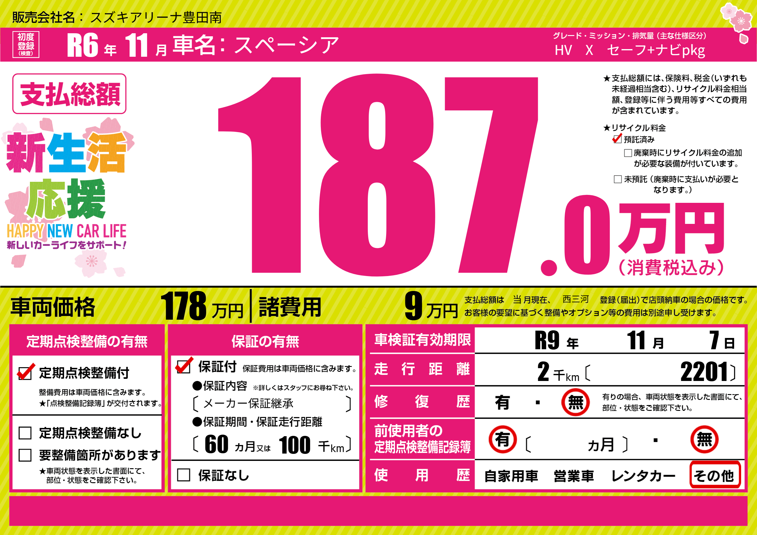 | 車名 | スペーシア | グレード ミッション 排気量 |