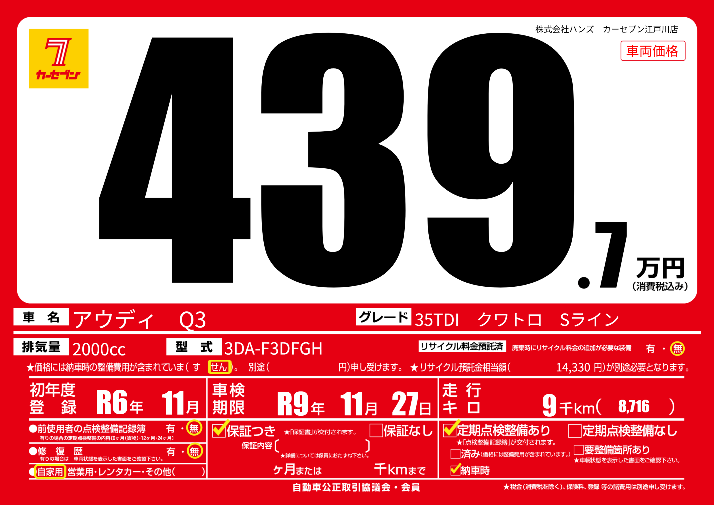 | 走行キロ | 0.9万km | 初年度登録 | R6年11月 |
