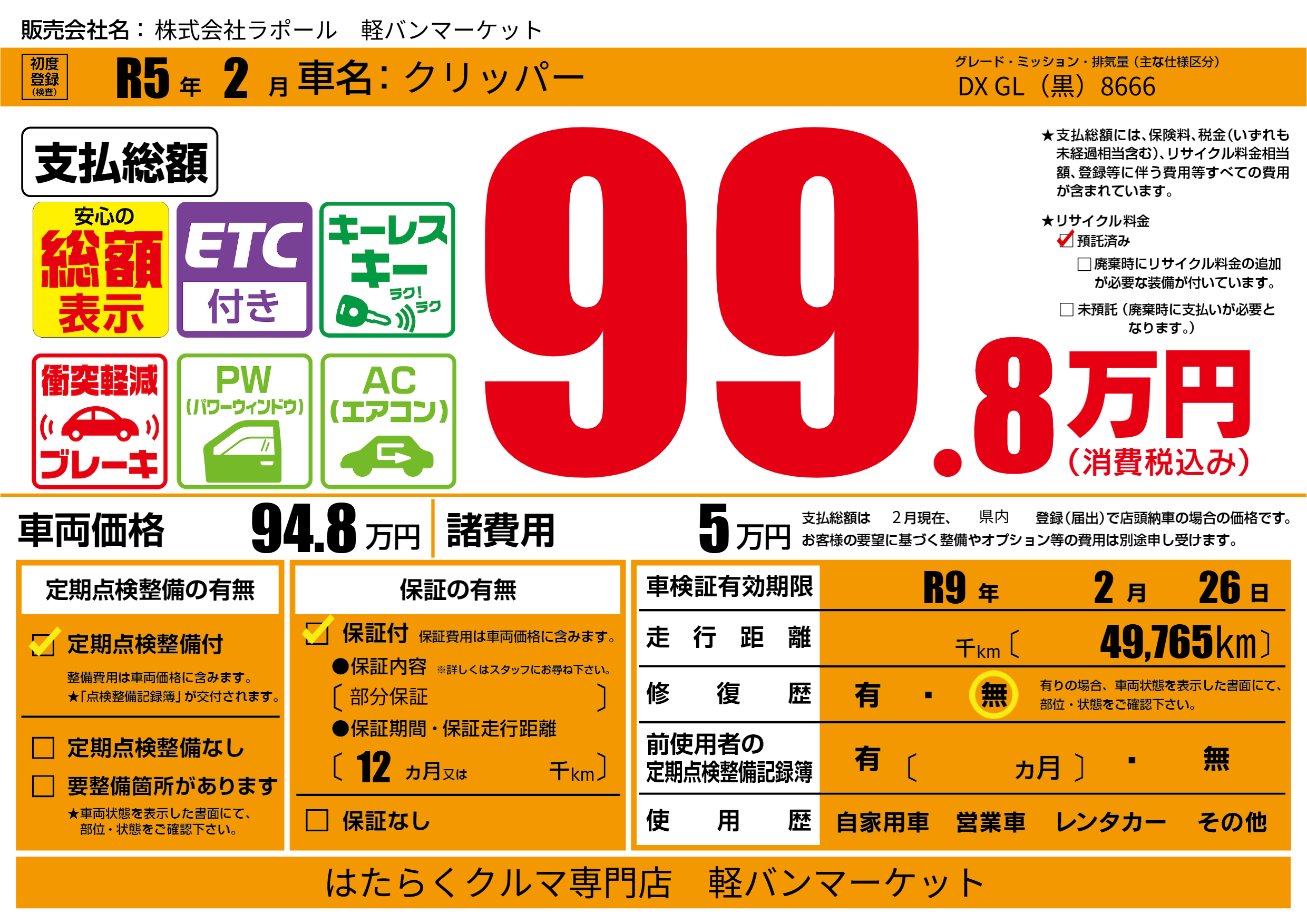 | 車名 | クリッパー | グレード ミッション 排気量 |