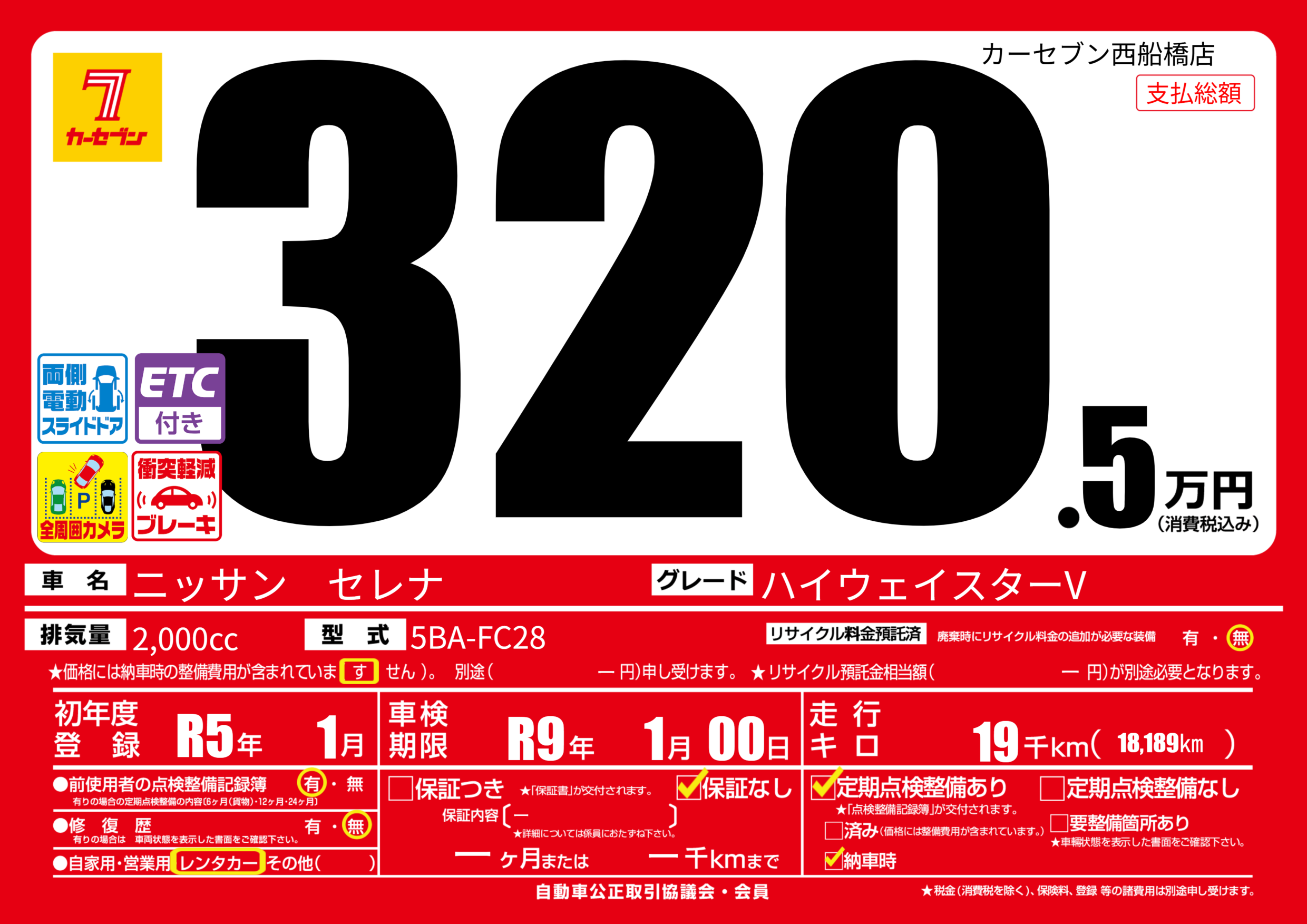 | 定期点検整備 | 定期点検整備あり 納車時あり | ||