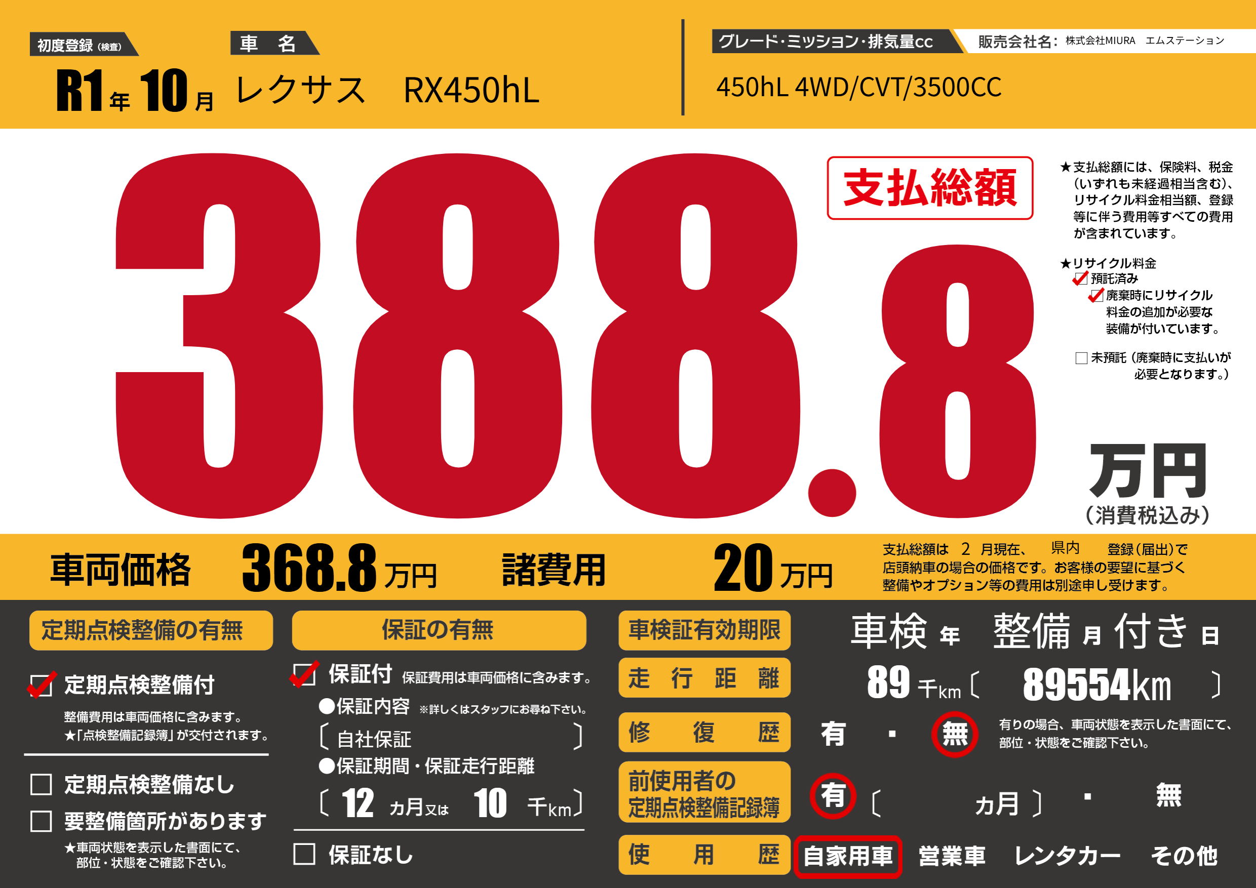 | 車名 | レクサス RX450hL | グレード ミッション 排気量 |