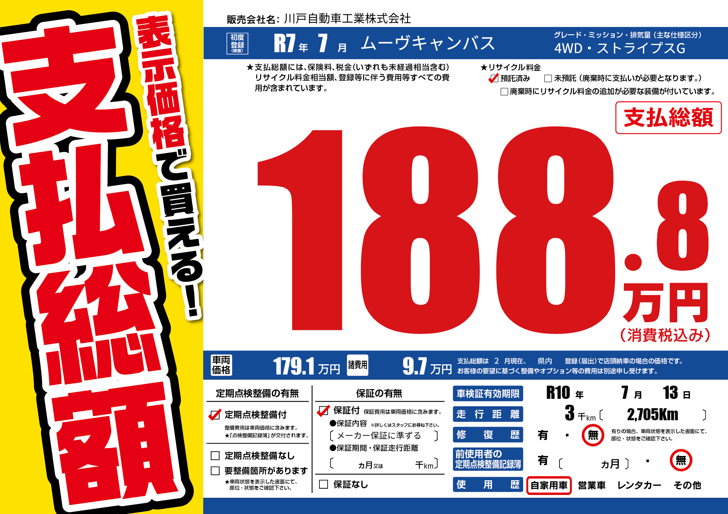 | 走行キロ | 0.3万km | 初年度登録 | R7年7月 |