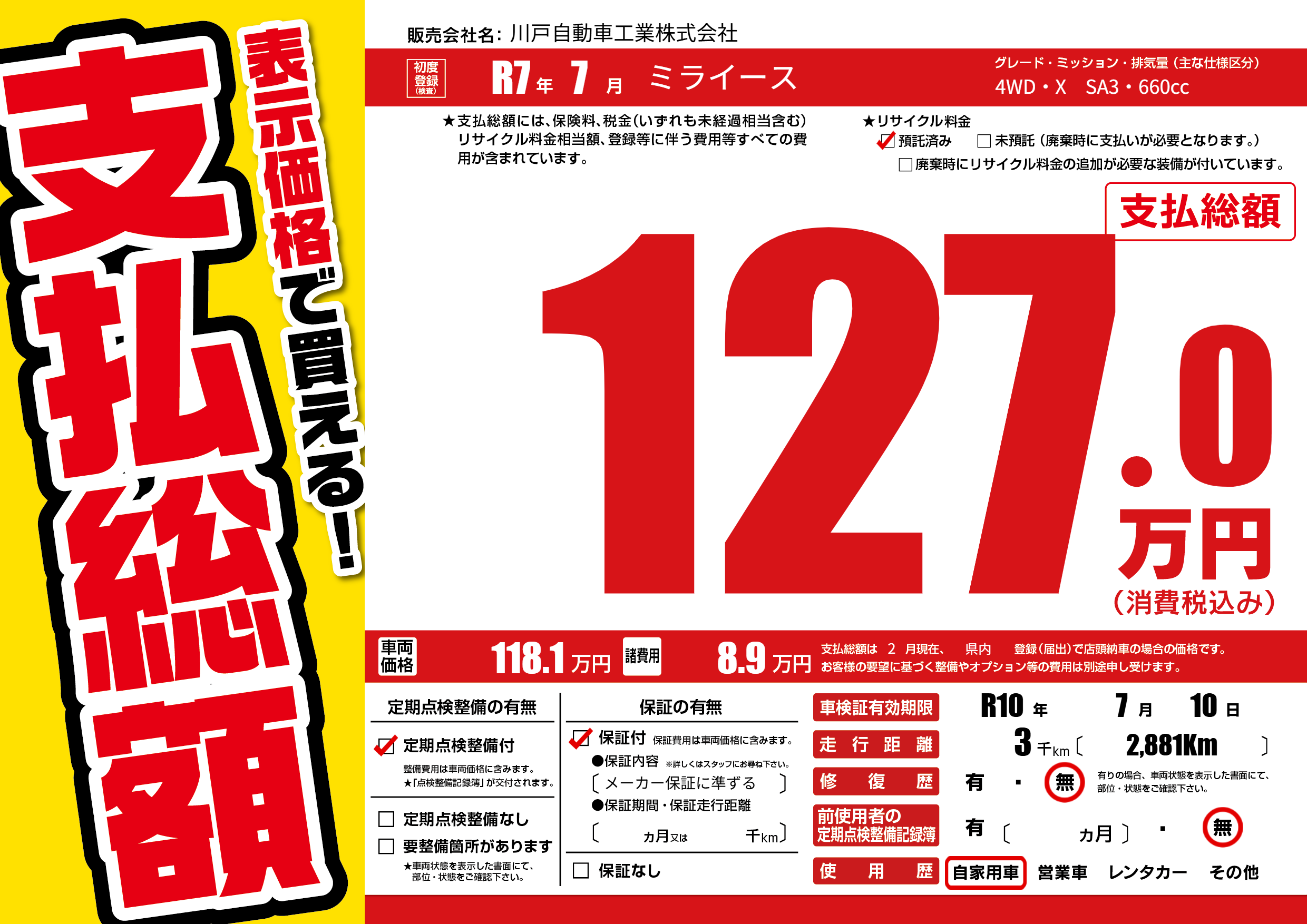 | 走行キロ | 0.3万km | 初年度登録 | R7年7月 |