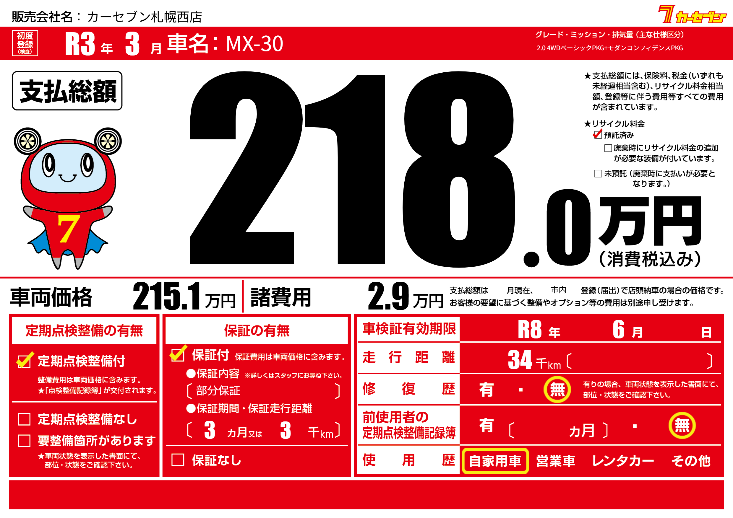 保証付き 保証内容(部分保証) 3ヶ月または(3)千kmまで |