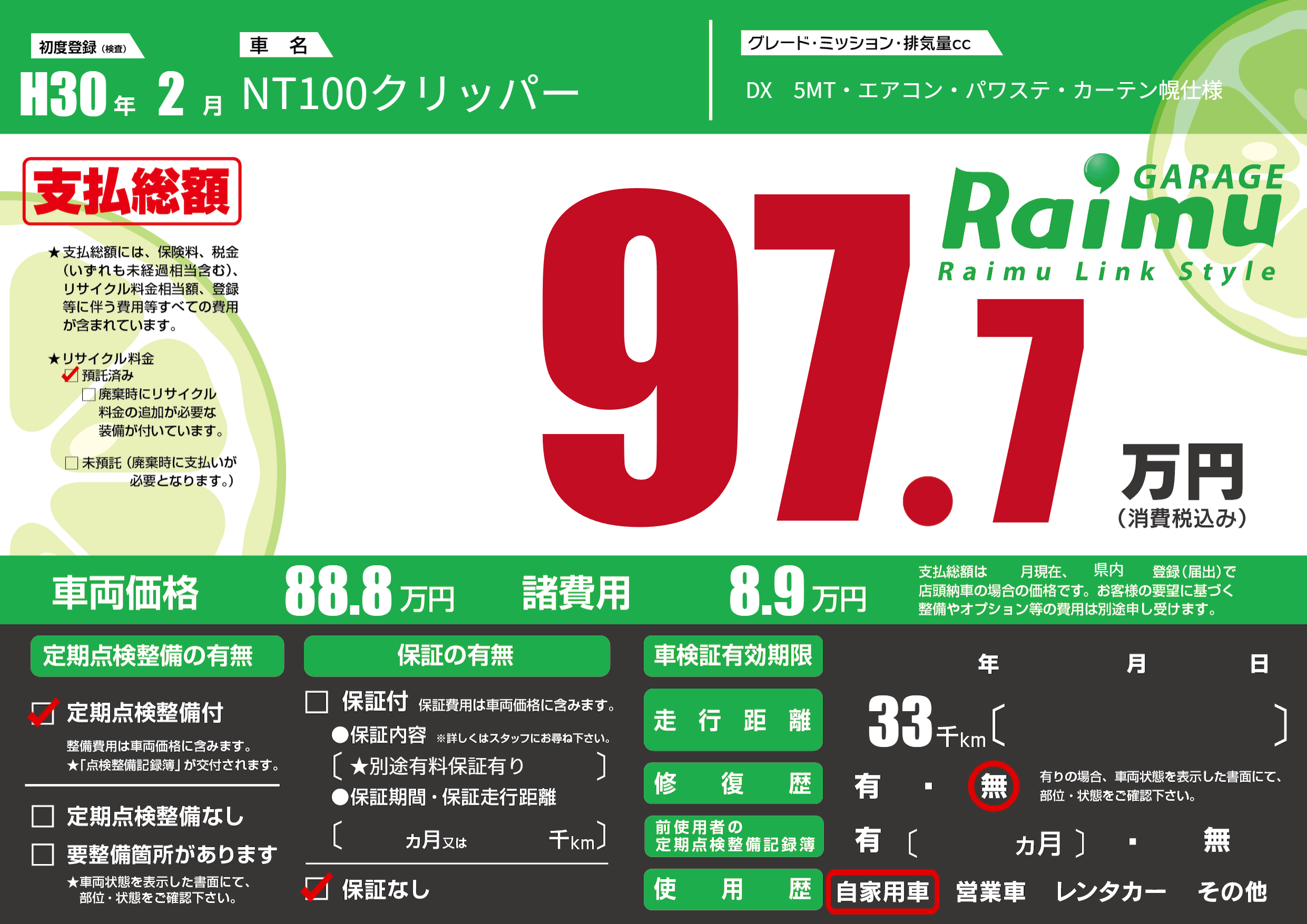 | 車名 | NT100クリッパー | グレード ミッション 排気量 |