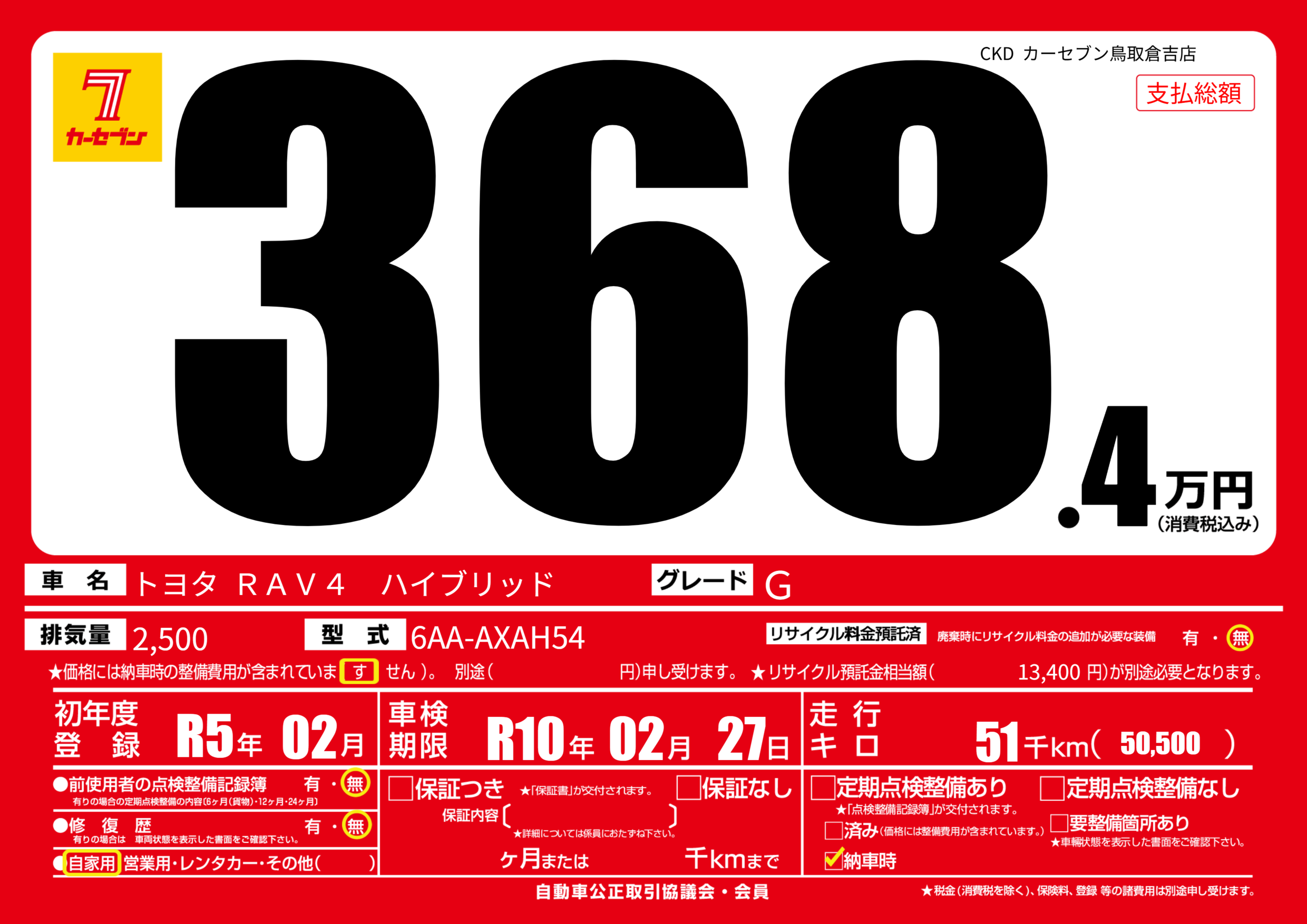 | 走行キロ | 5.1万km | 初年度登録 | R5年02月 |