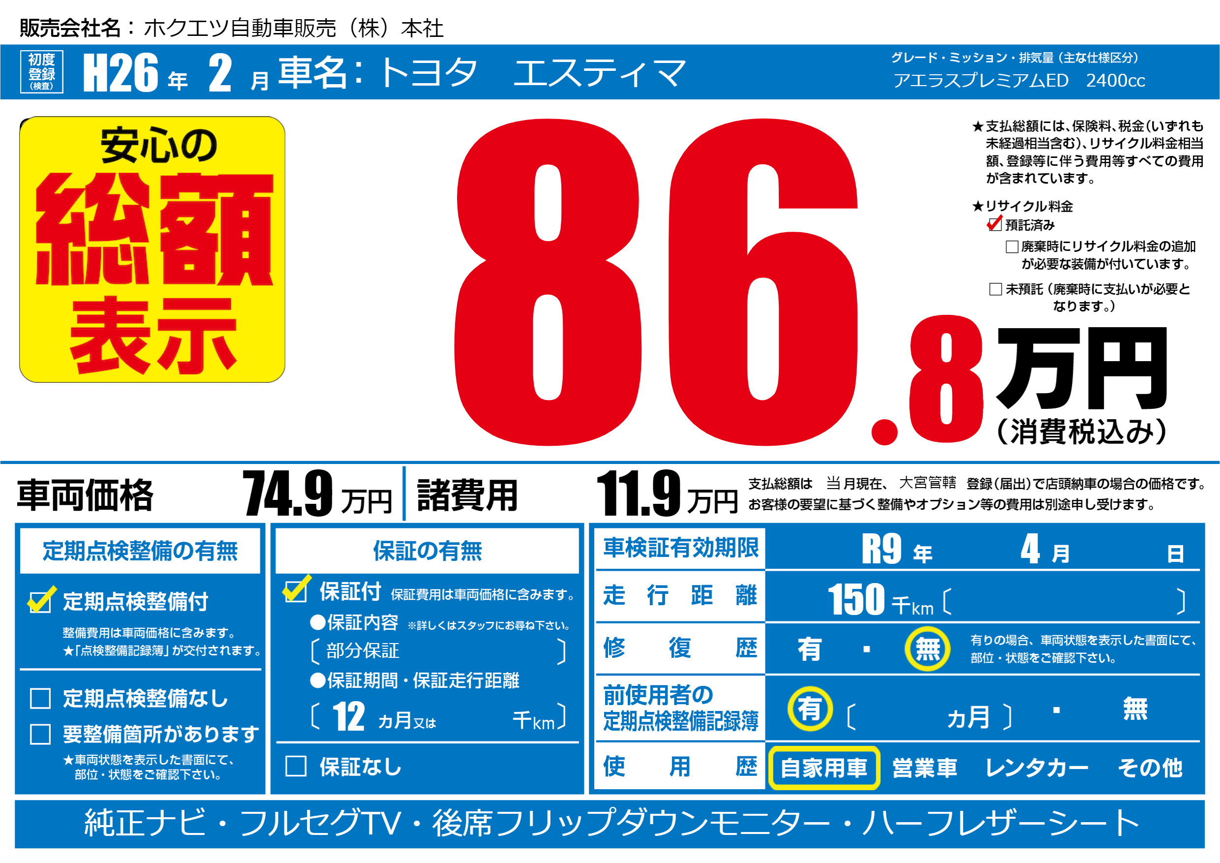 | 車名 | トヨタ エスティマ | グレード ミッション 排気量 |