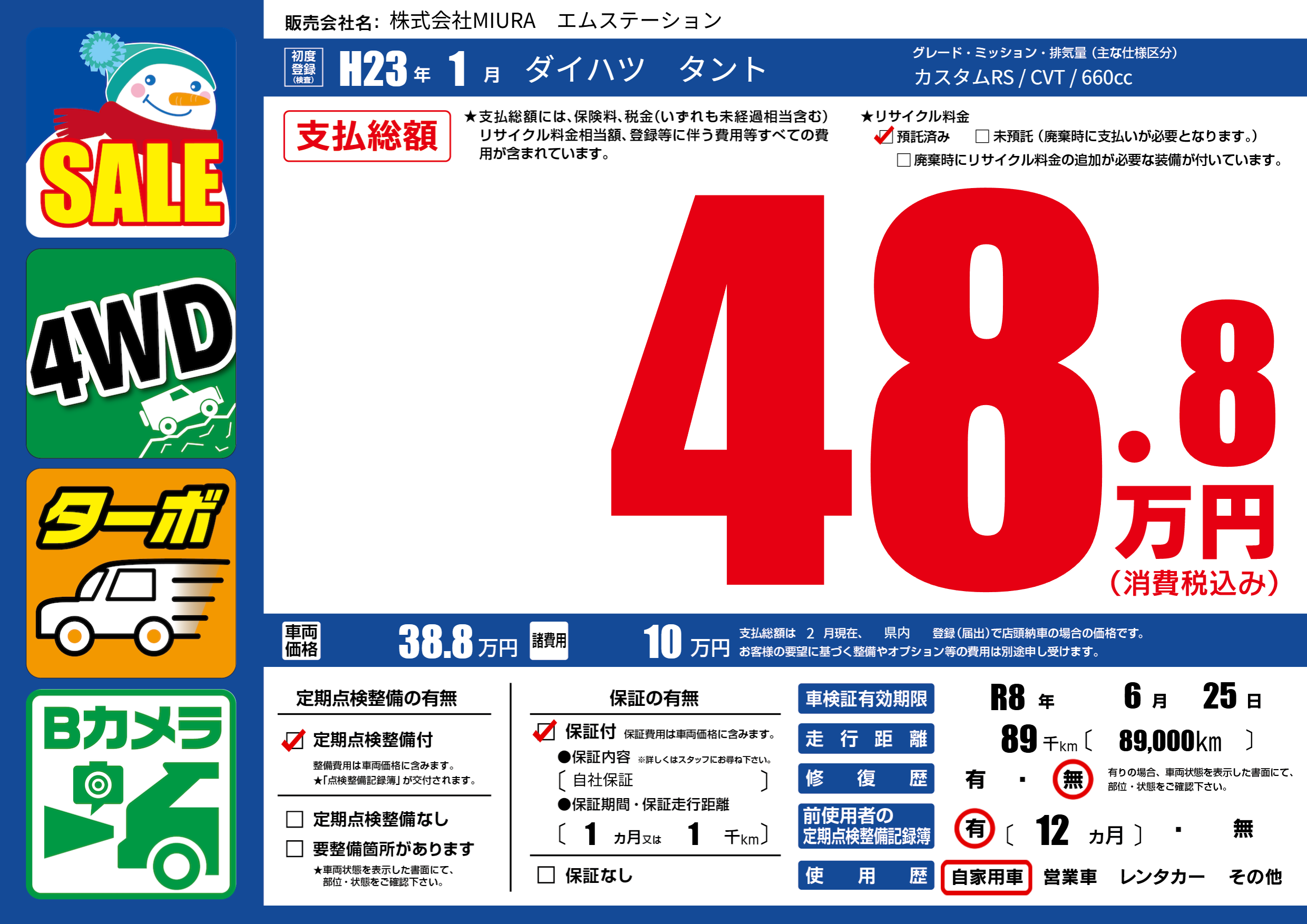 | 走行キロ | 8.9万km | 初年度登録 | H23年1月 |