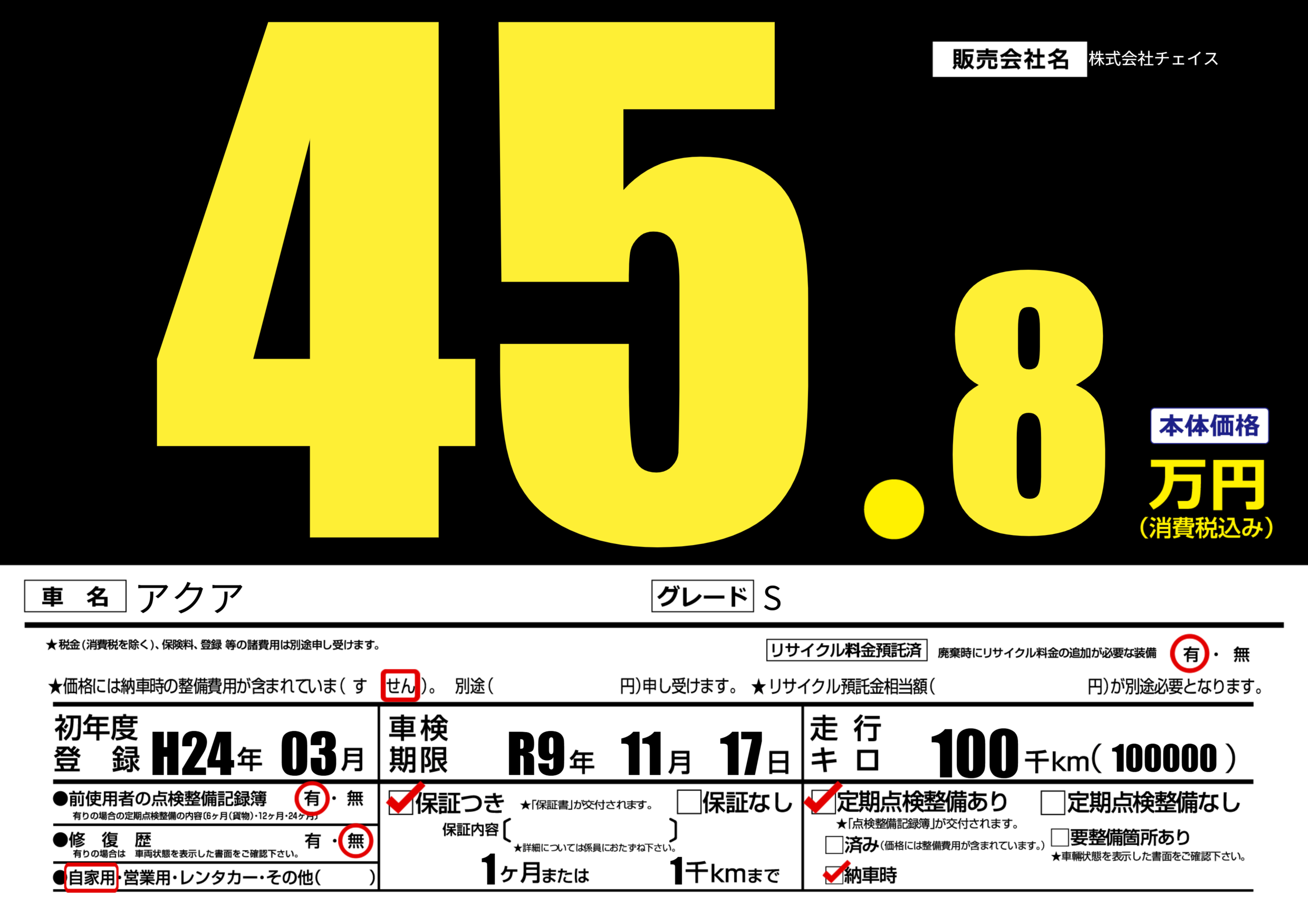 | 定期点検整備 | 定期点検整備あり 納車時あり | ||