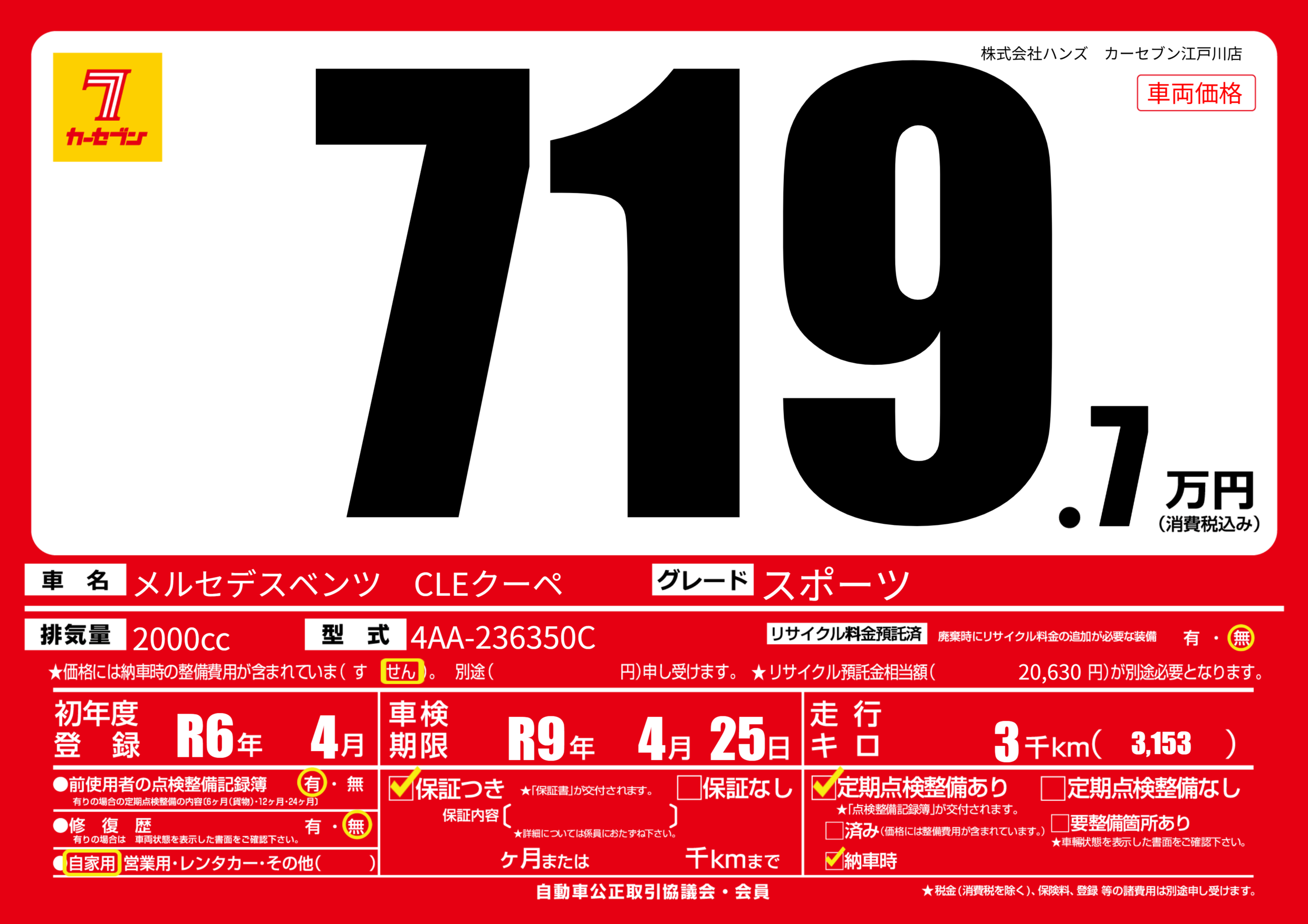 | 車名 | メルセデスベンツ CLEクーペ | グレード ミッション 排気量 |