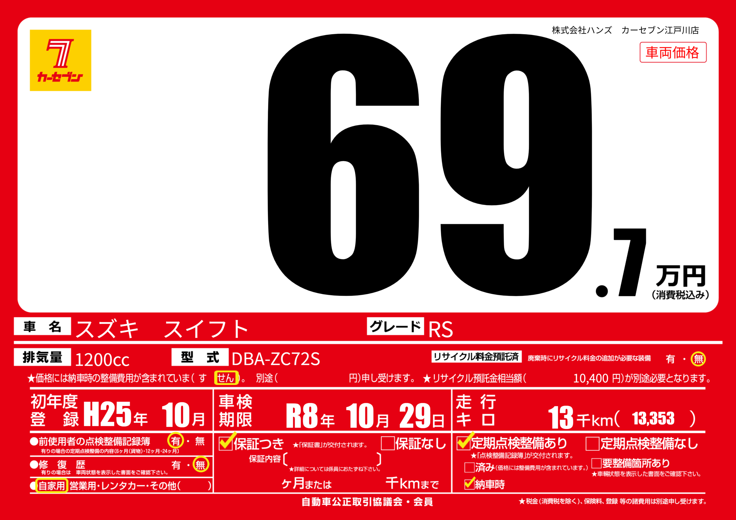 | 走行キロ | 1.3万km | 初年度登録 | H25年10月 |