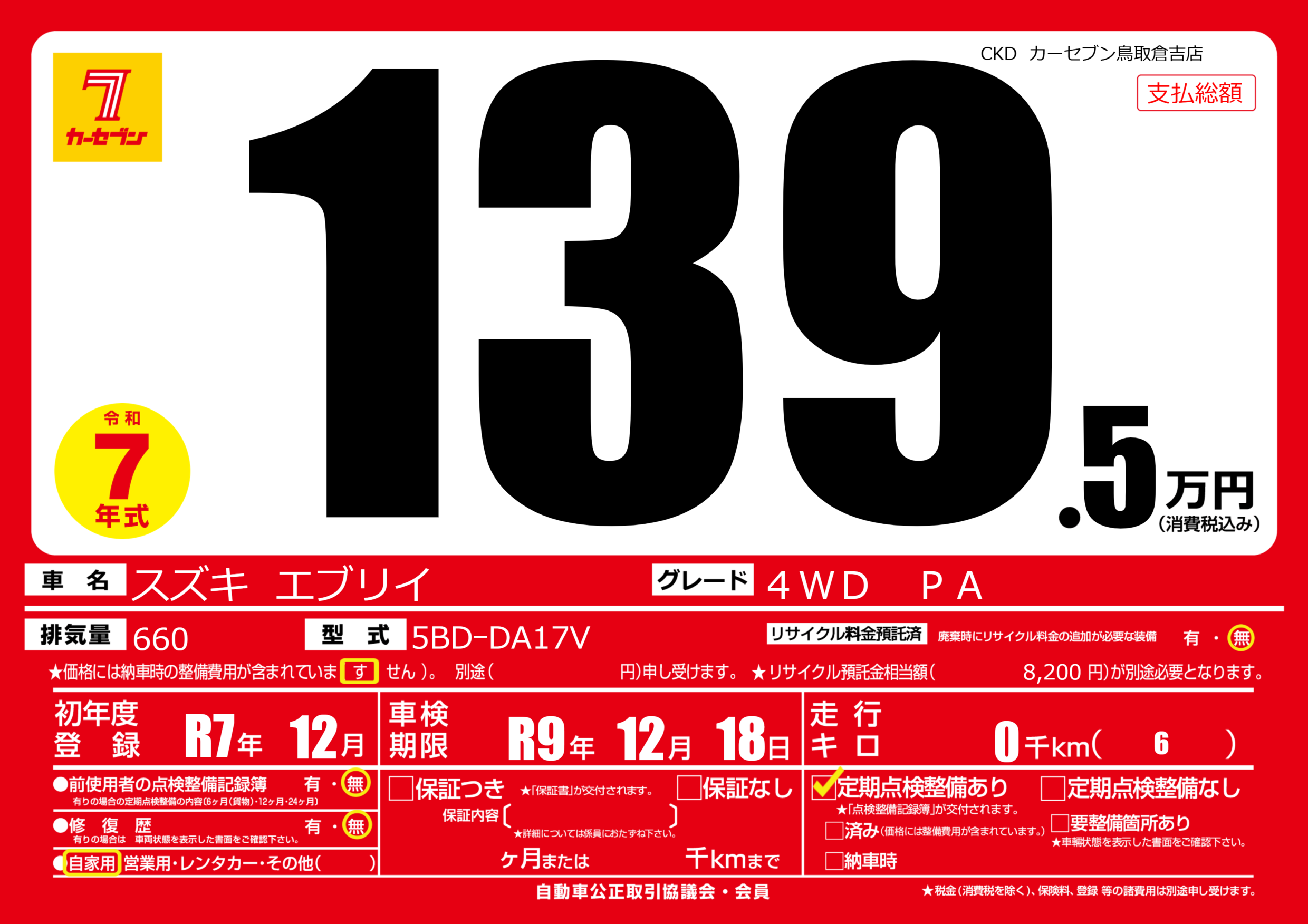 | 走行キロ | - | 初年度登録 | R7年12月 |
