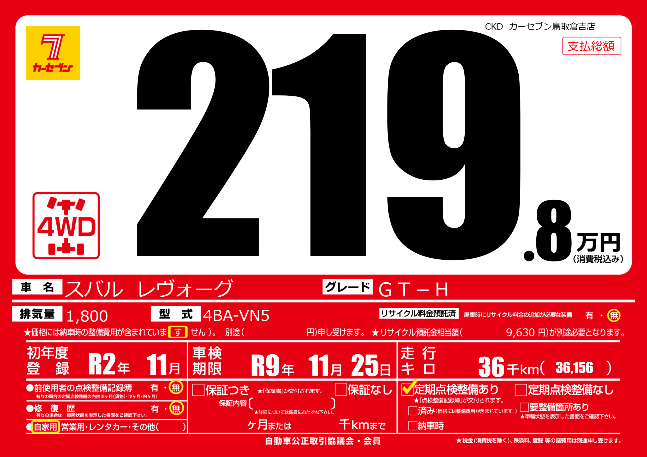 | 車名 | スバル レヴォーグ | グレード ミッション 排気量 |
