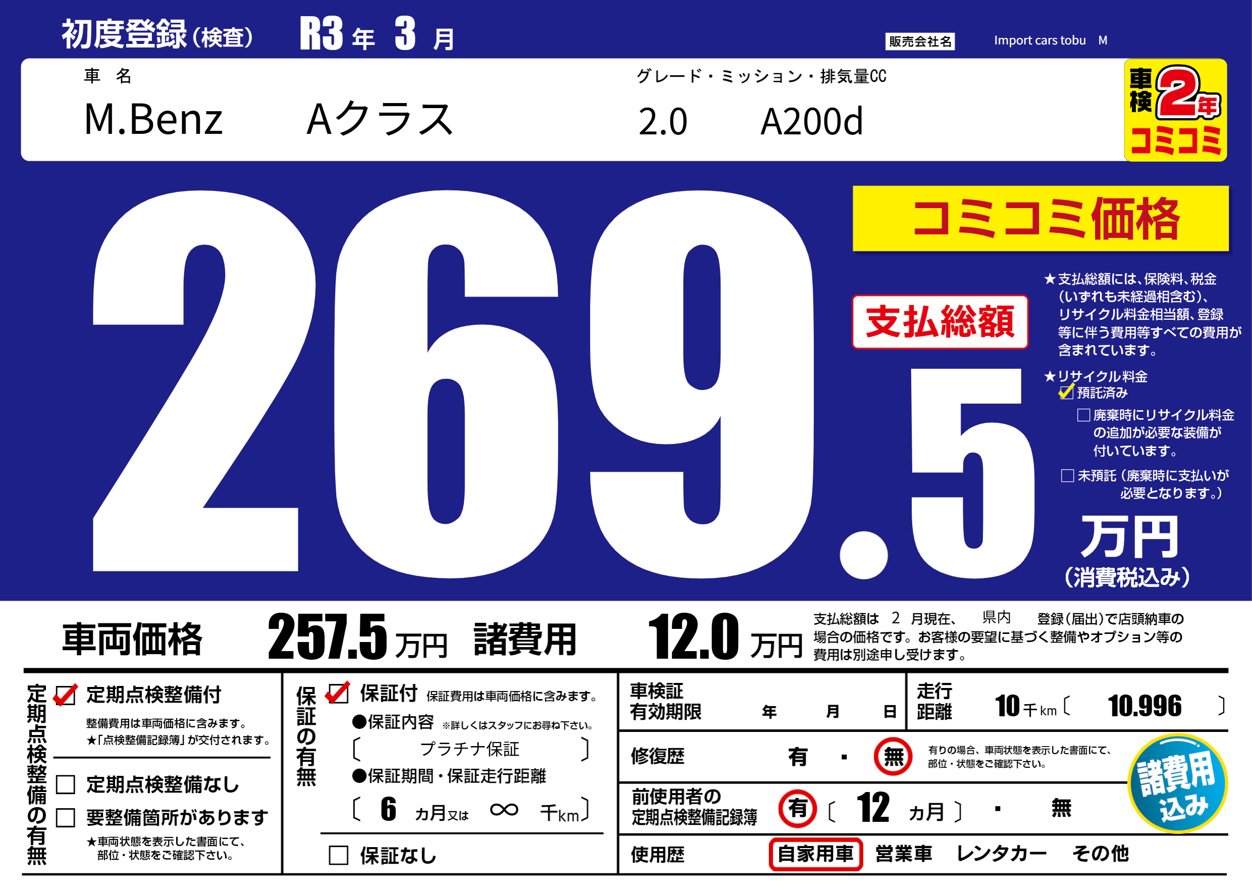 | 車名 | M.Benz Aクラス | グレード ミッション 排気量 |