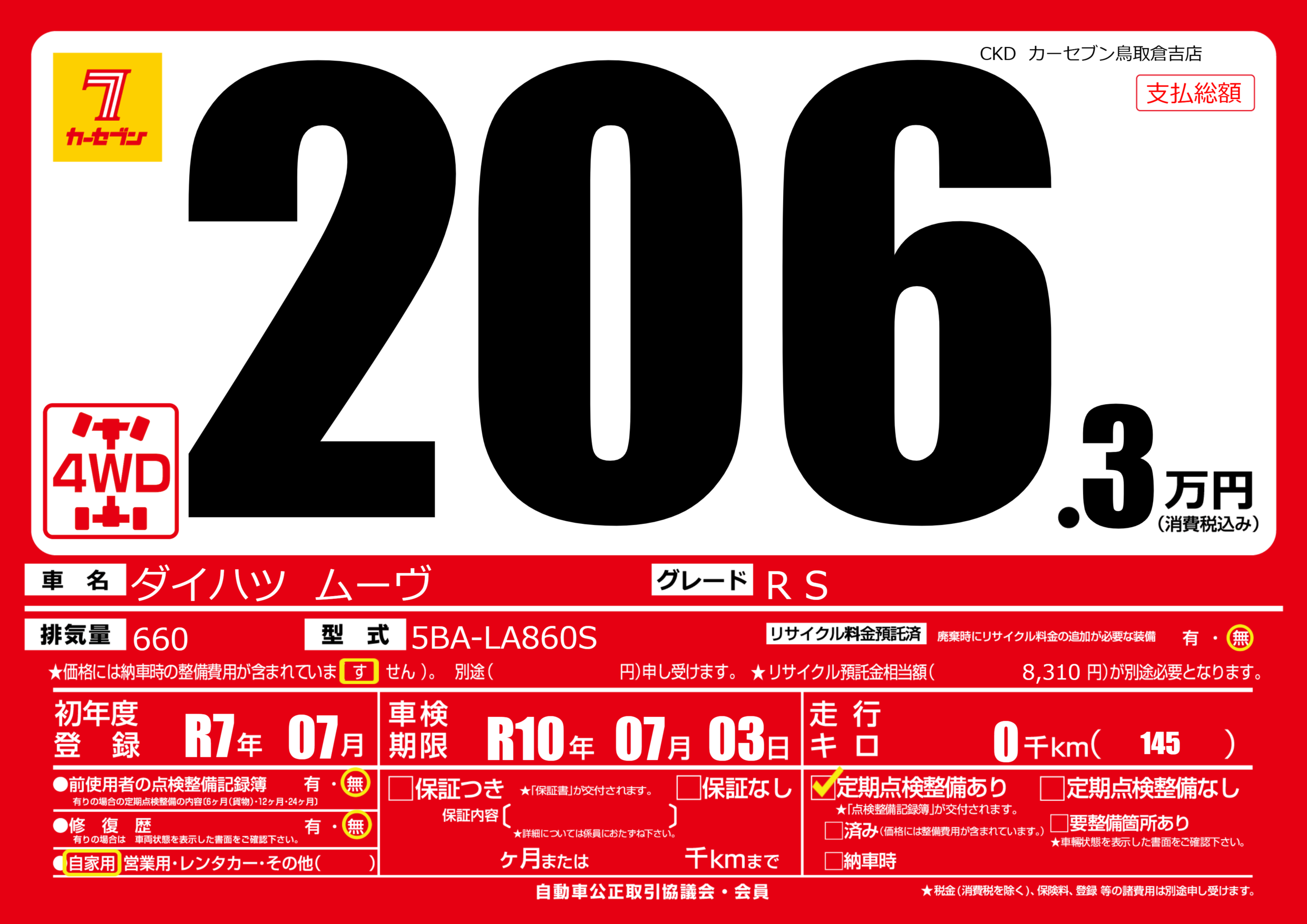 | 車検制限 | R10年 07月 03日 | ||