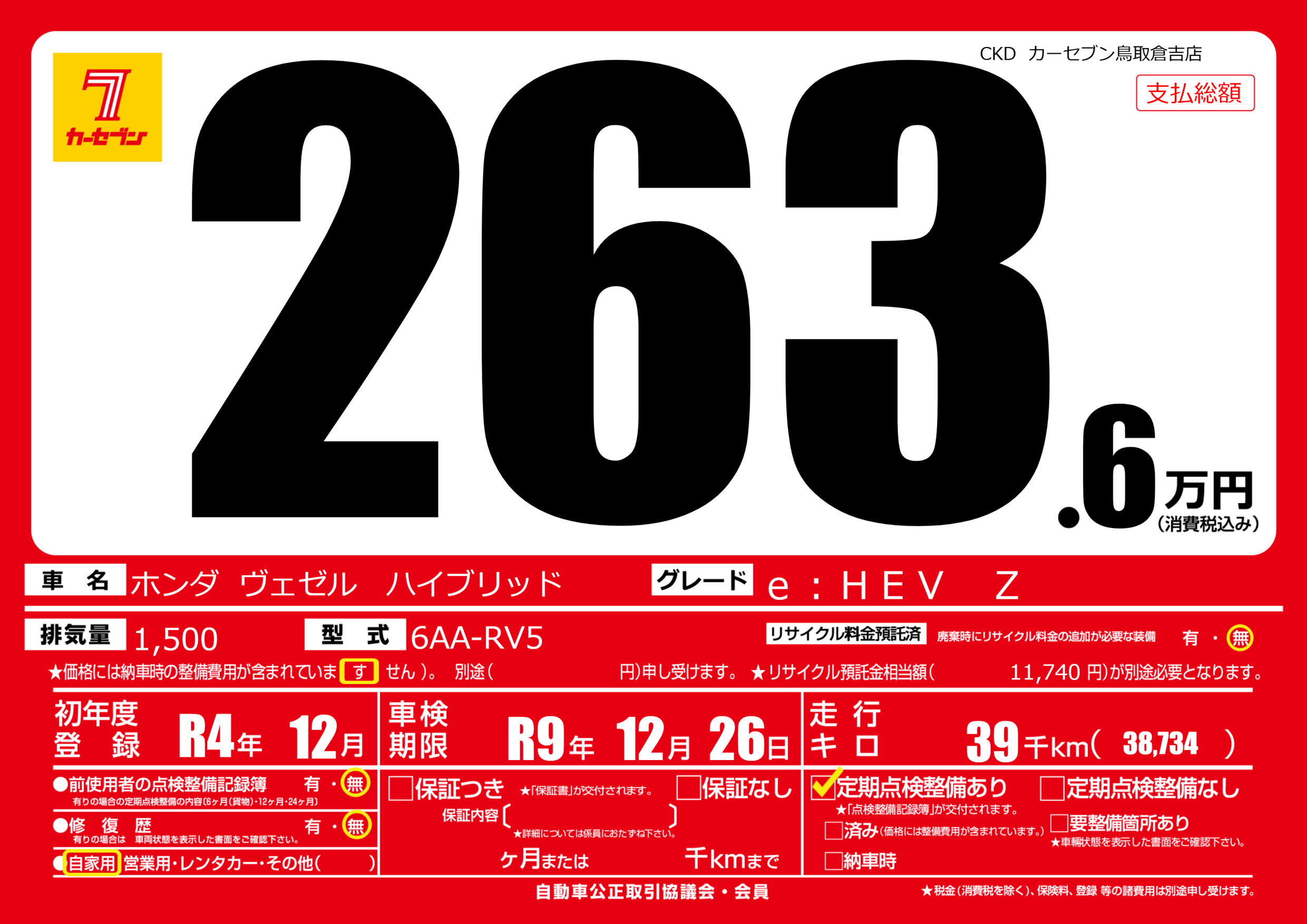 | 車名 | ホンダ ヴェゼル ハイブリッド | グレード ミッション 排気量 |