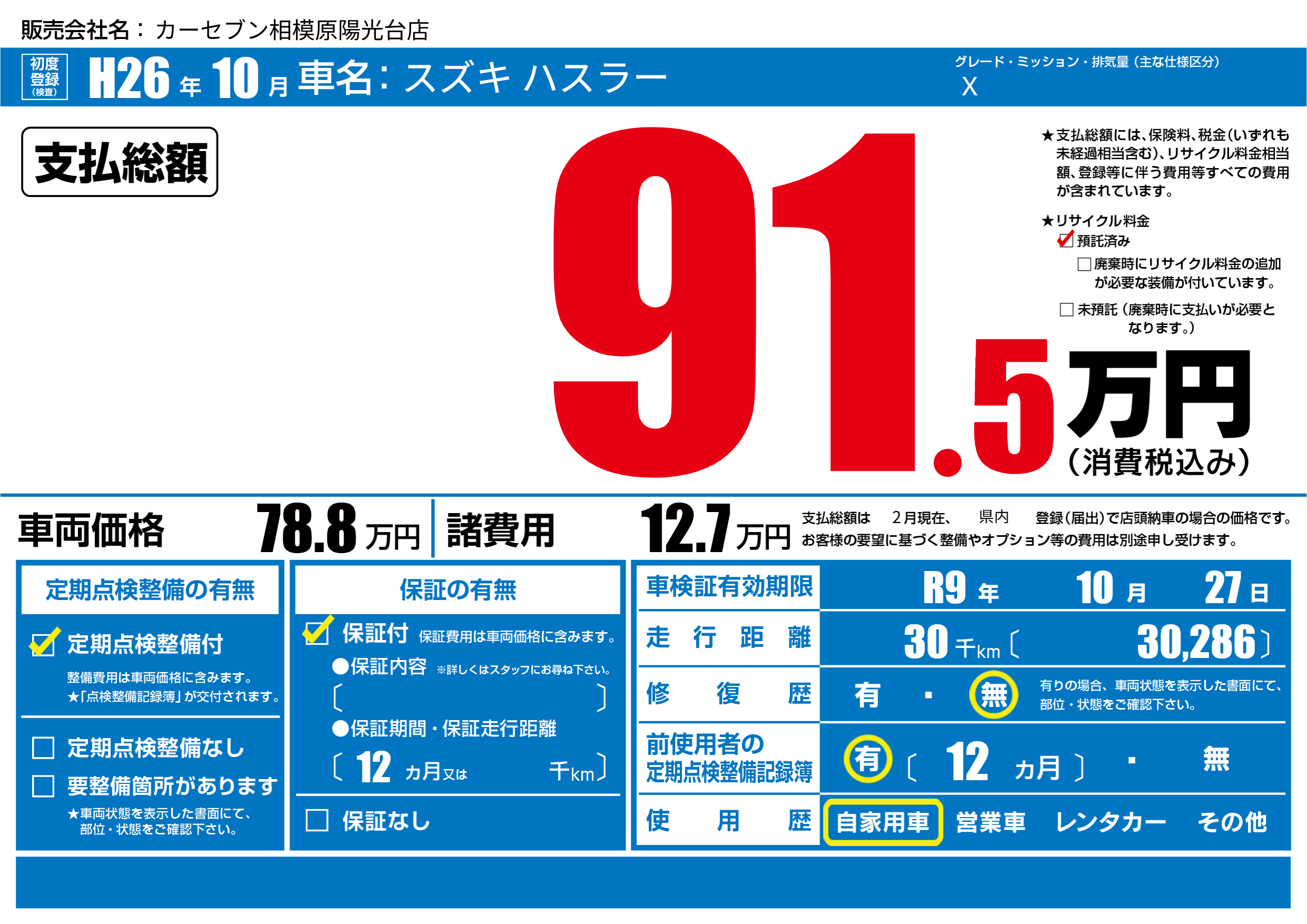 | 走行キロ | 3万km | 初年度登録 | H26年10月 |