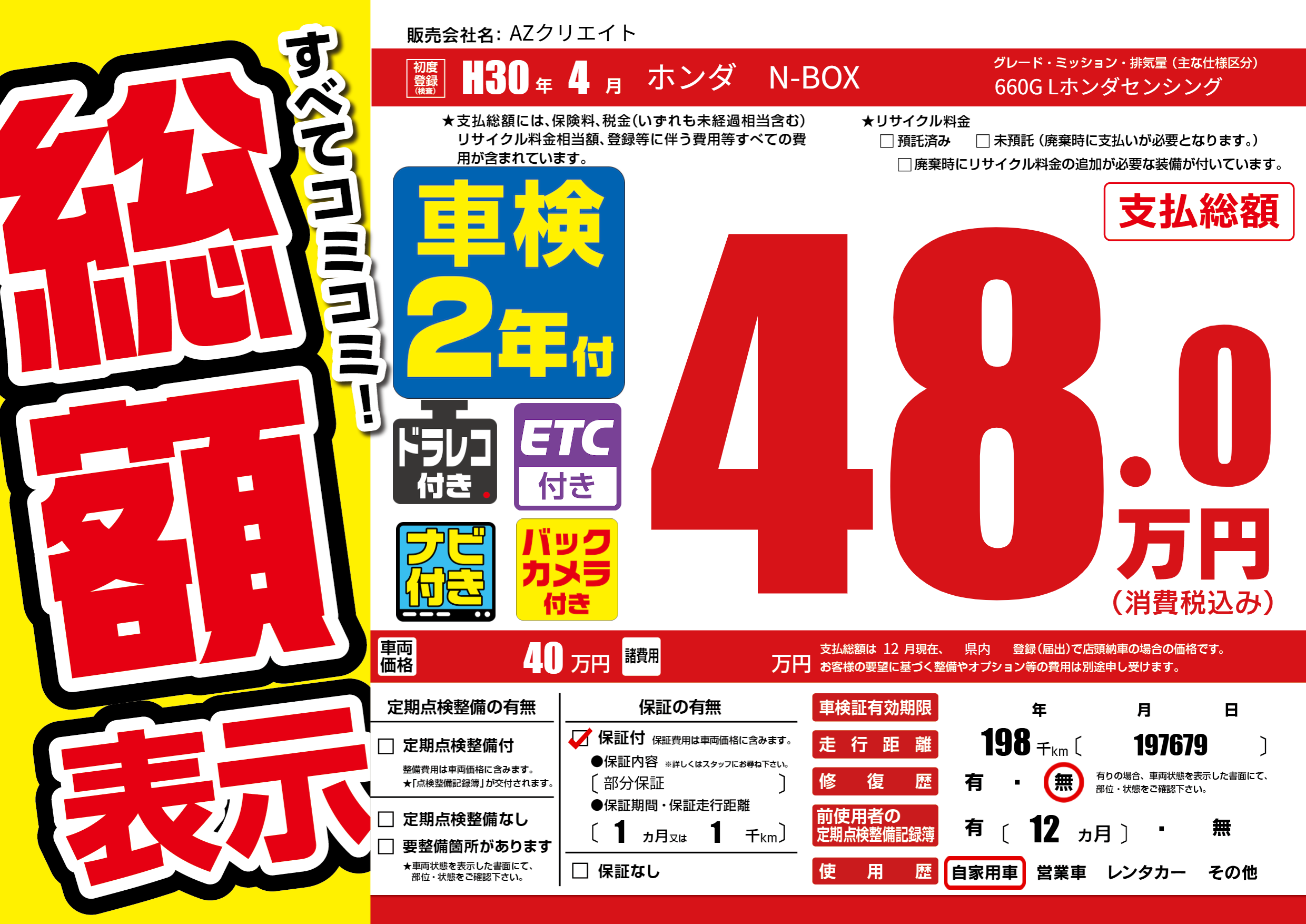 | 走行キロ | 19.8万km | 初年度登録 | H30年4月 |