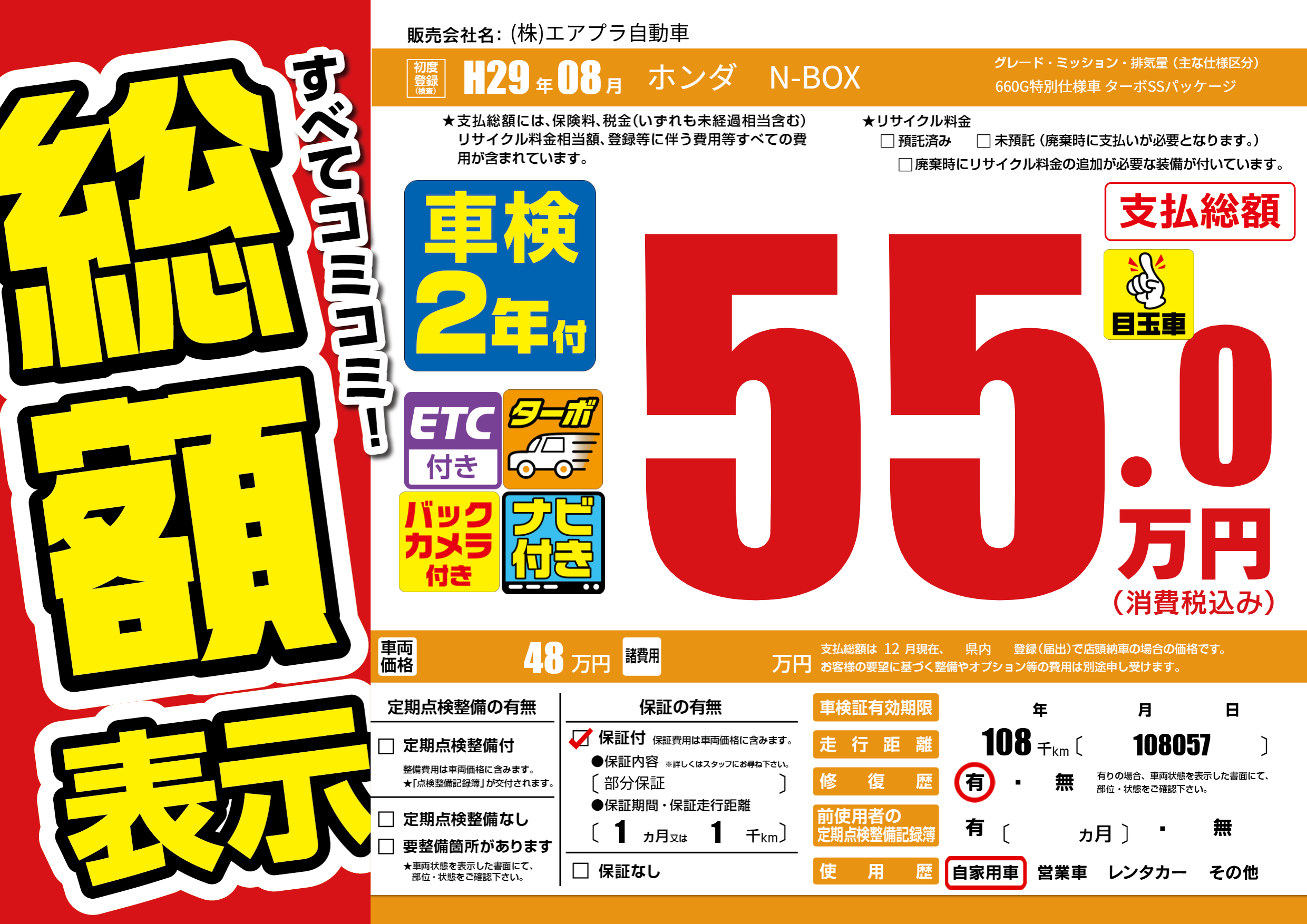 | 走行キロ | 10.8万km | 初年度登録 | H29年08月 |