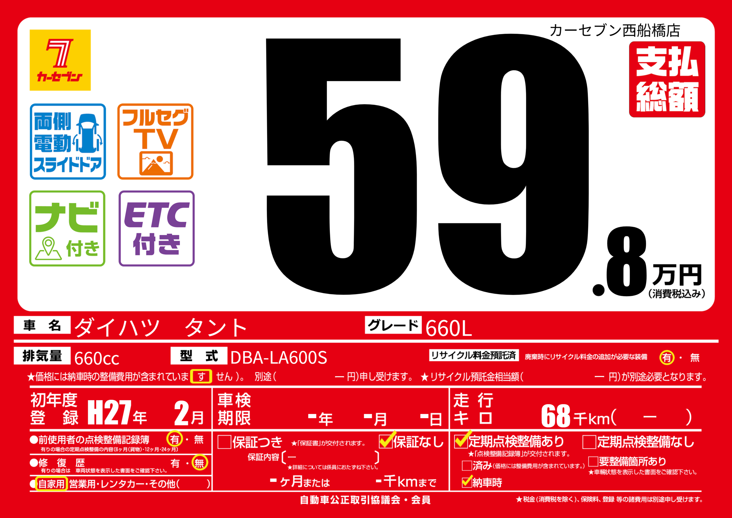 | 走行キロ | 6.8万km | 初年度登録 | H27年2月 |