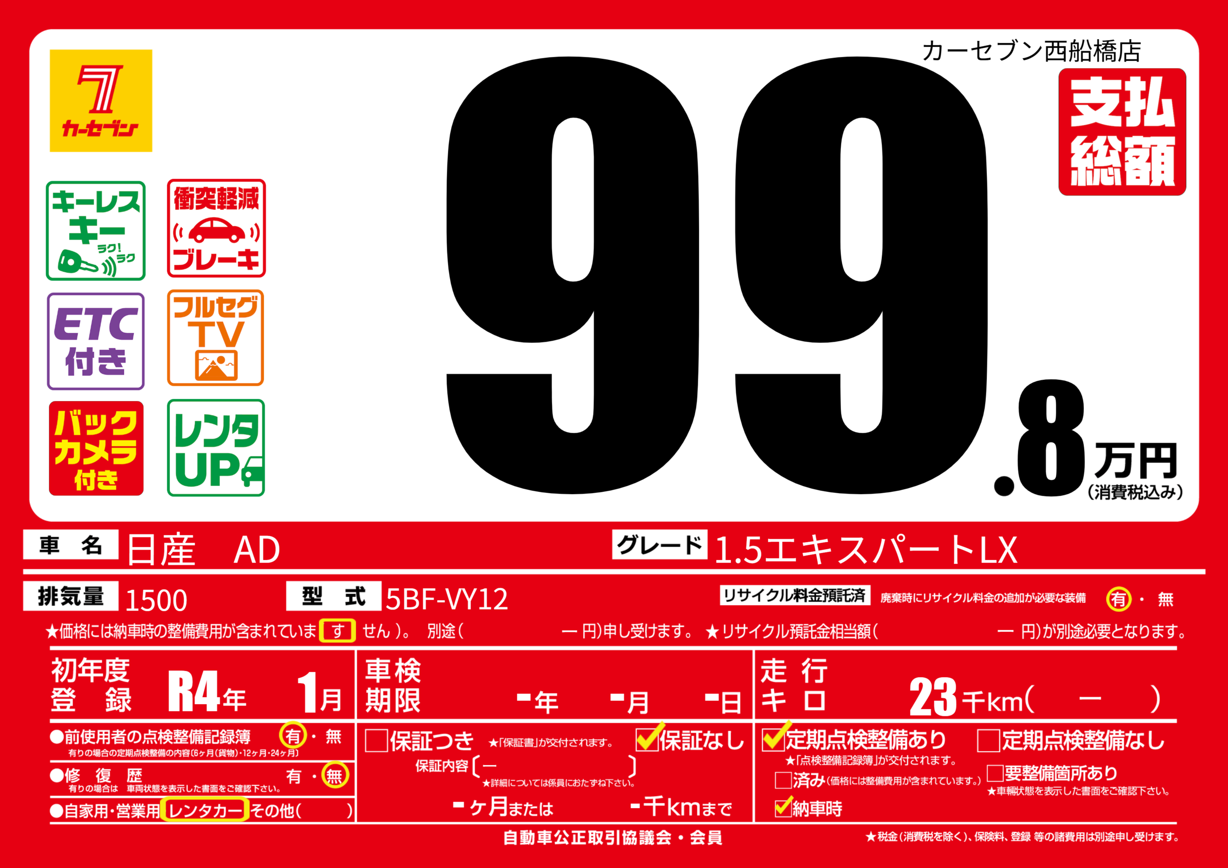 | 車名 | 日産 AD | グレード ミッション 排気量 |