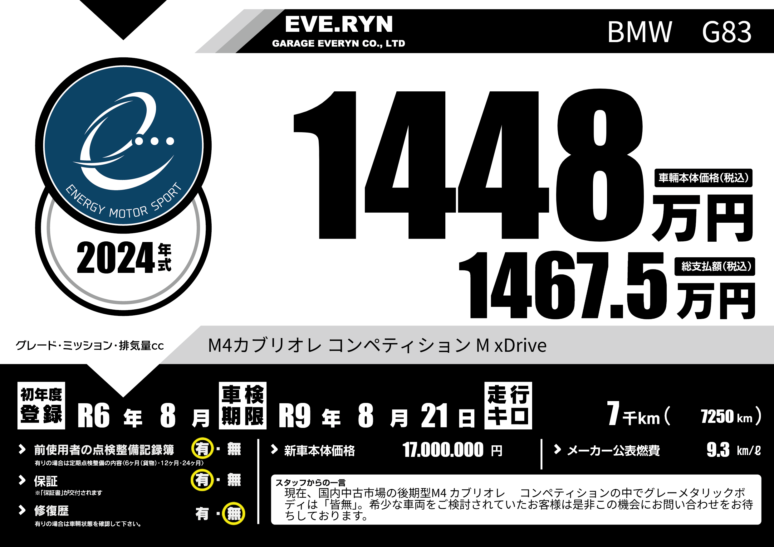 | 車名 | BMW G83 | グレード ミッション 排気量 |