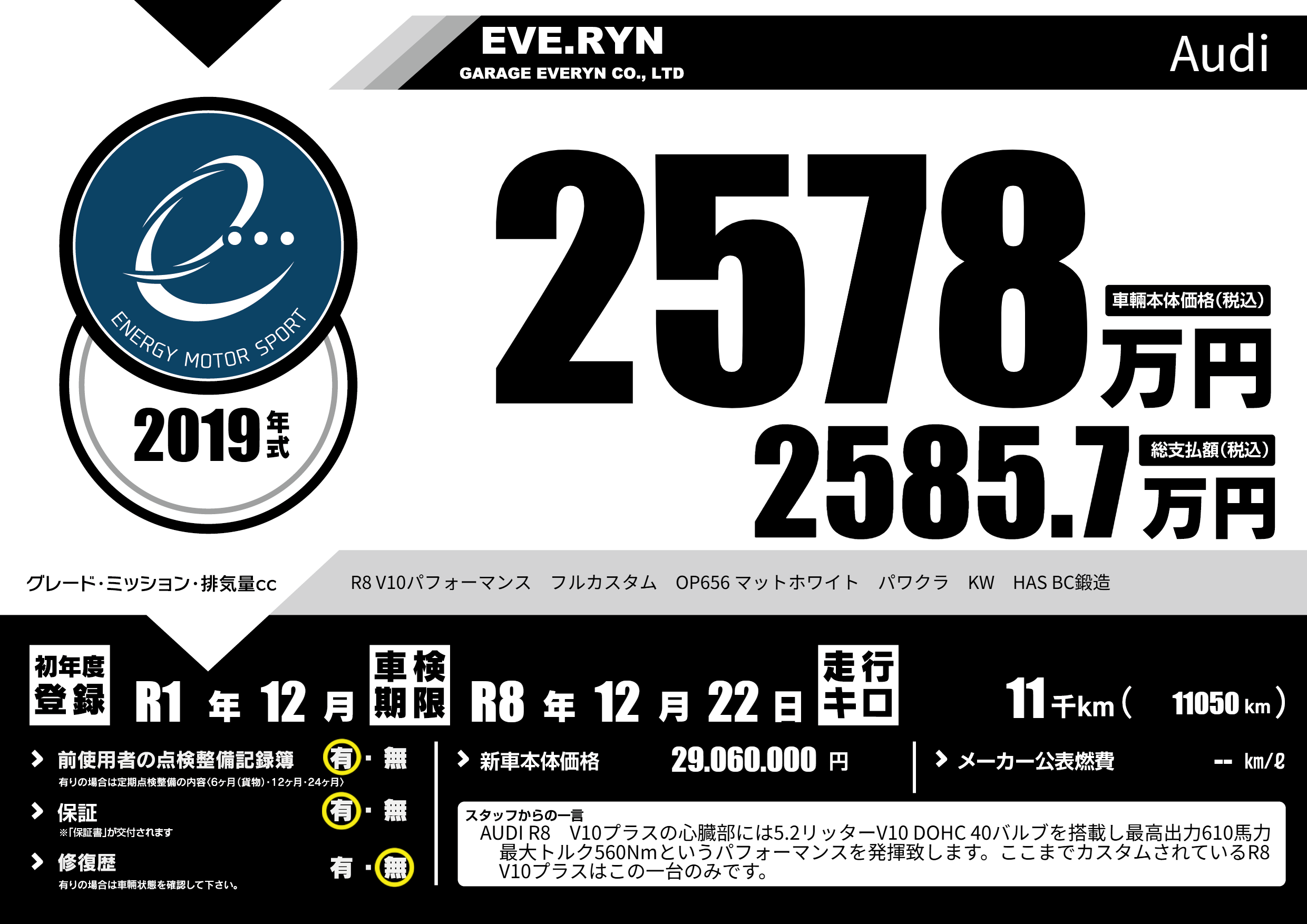 R8 V10パフォーマンス フルカスタム OP656 マットホワイト パワクラ KW HAS BC鍛造 |