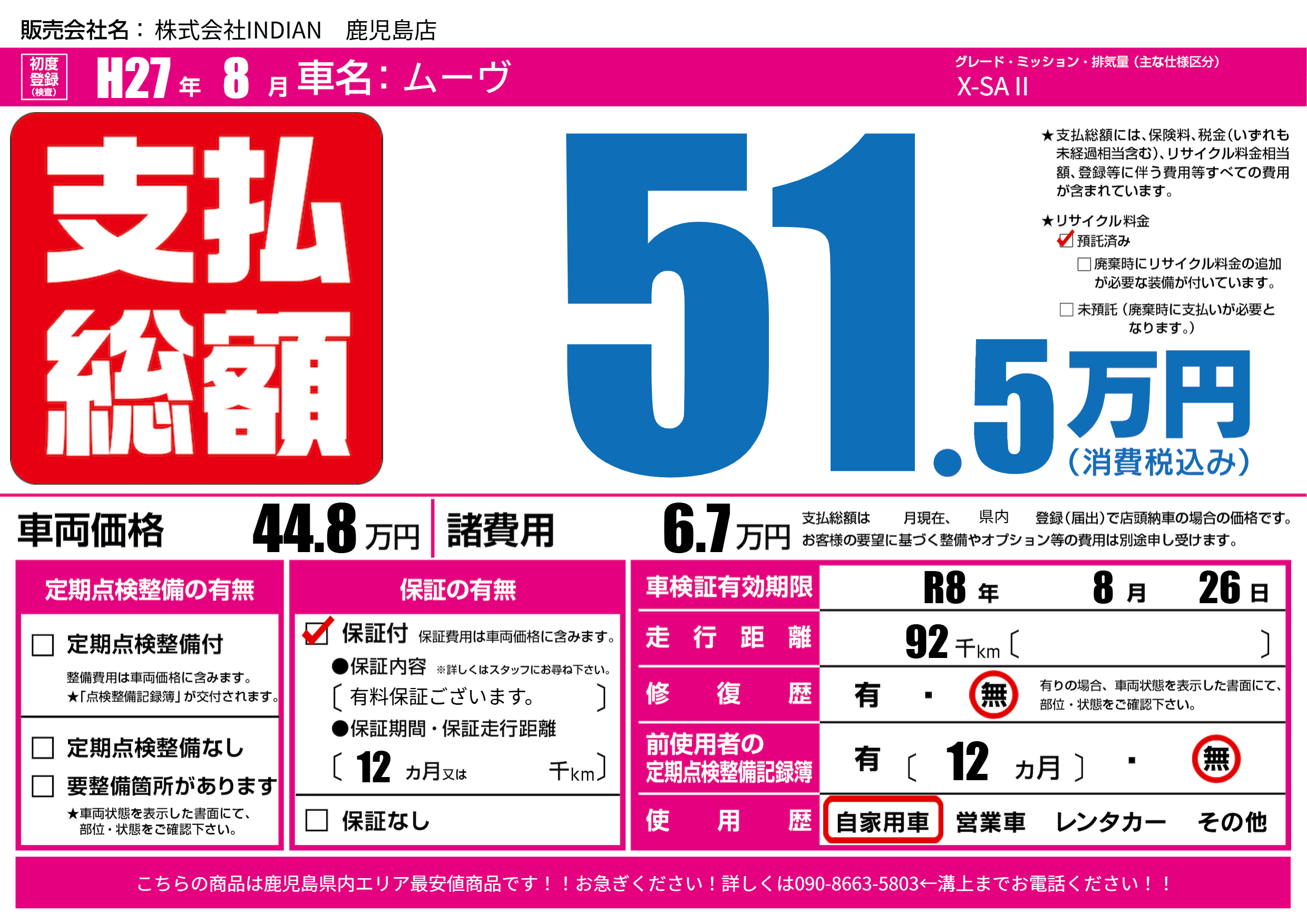 | 走行キロ | 9.2万km | 初年度登録 | H27年8月 |