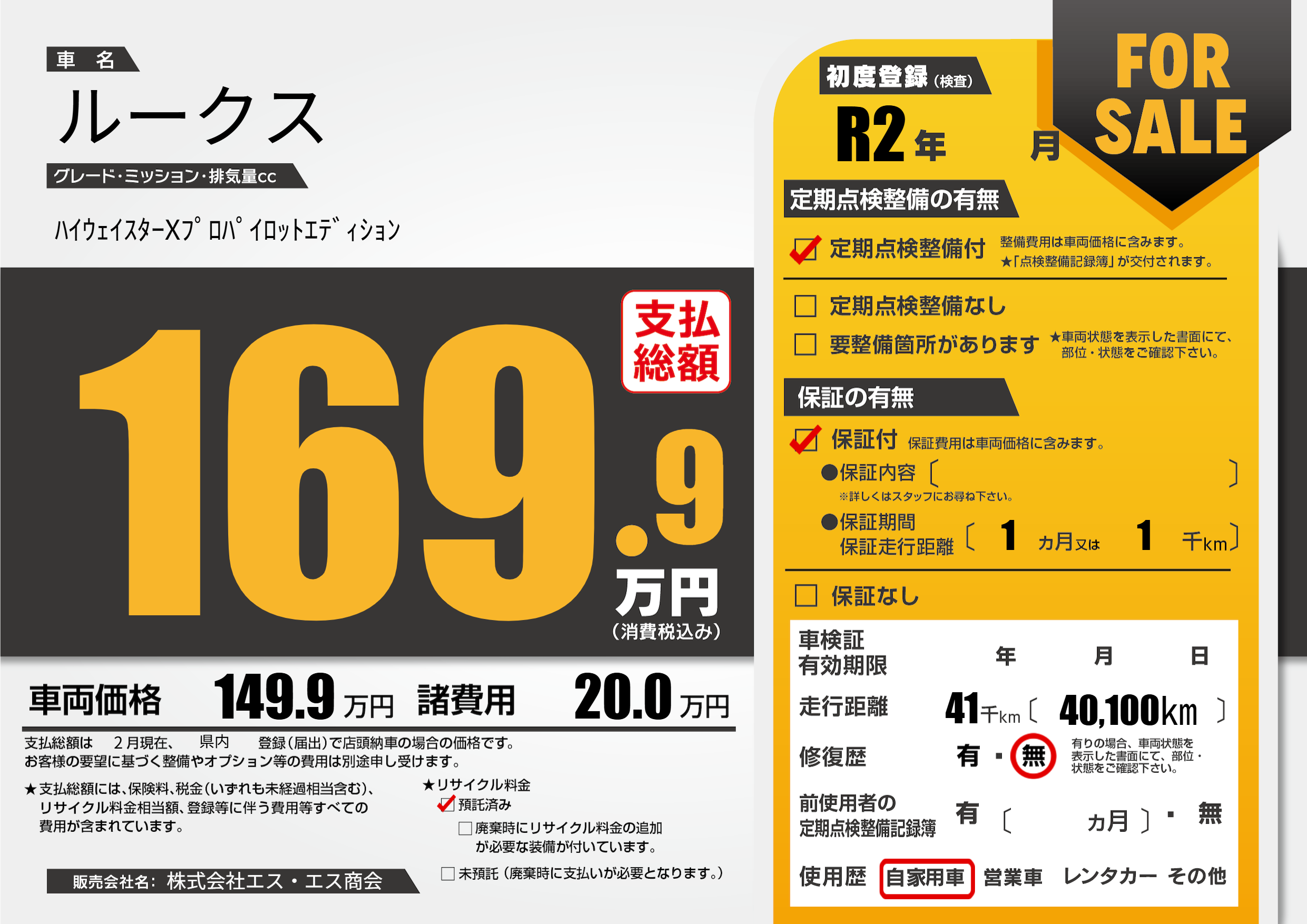 | 走行キロ | 4.1万km | 初年度登録 | R2年---月 |
