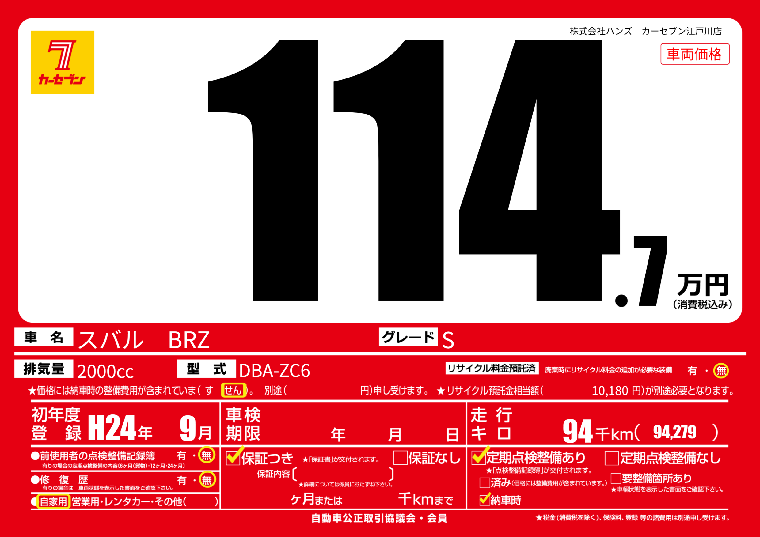 | 車名 | スバル BRZ | グレード ミッション 排気量 |