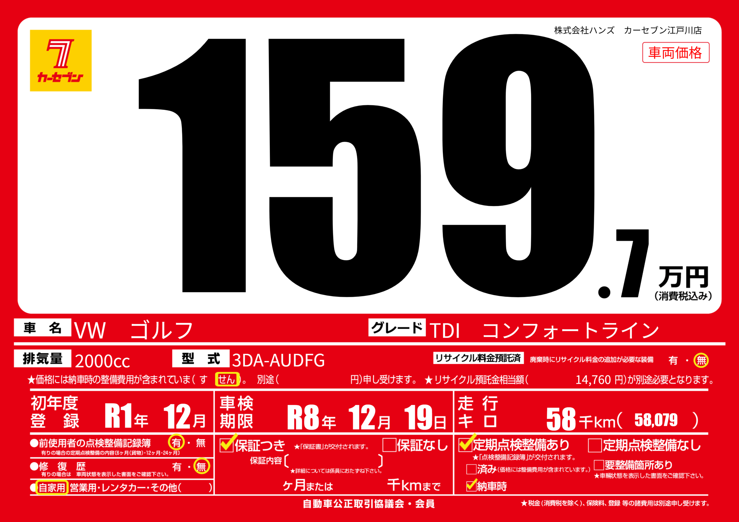 | 車名 | VW ゴルフ | グレード ミッション 排気量 |