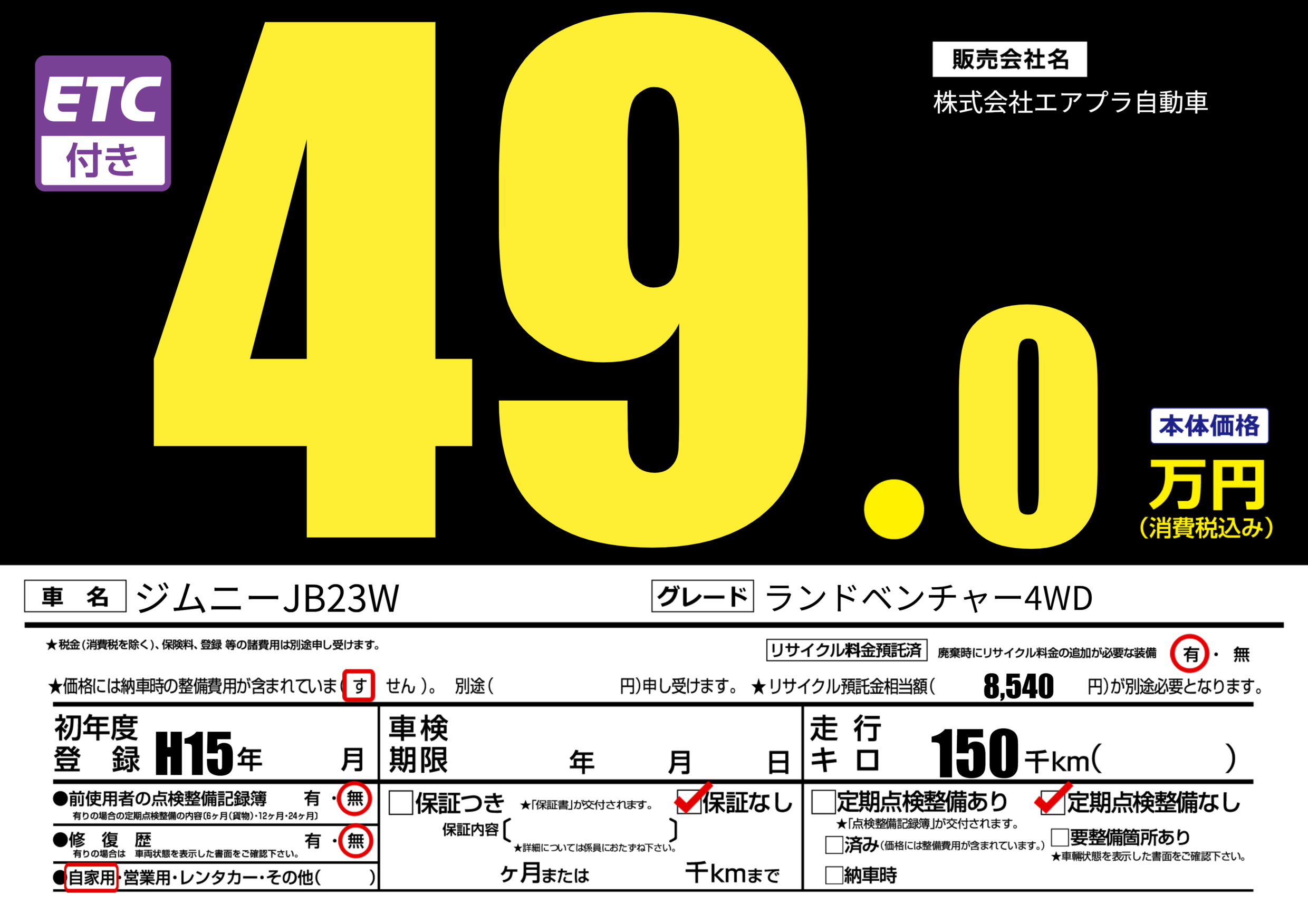 | 走行キロ | 15万km | 初年度登録 | H15年---月 |