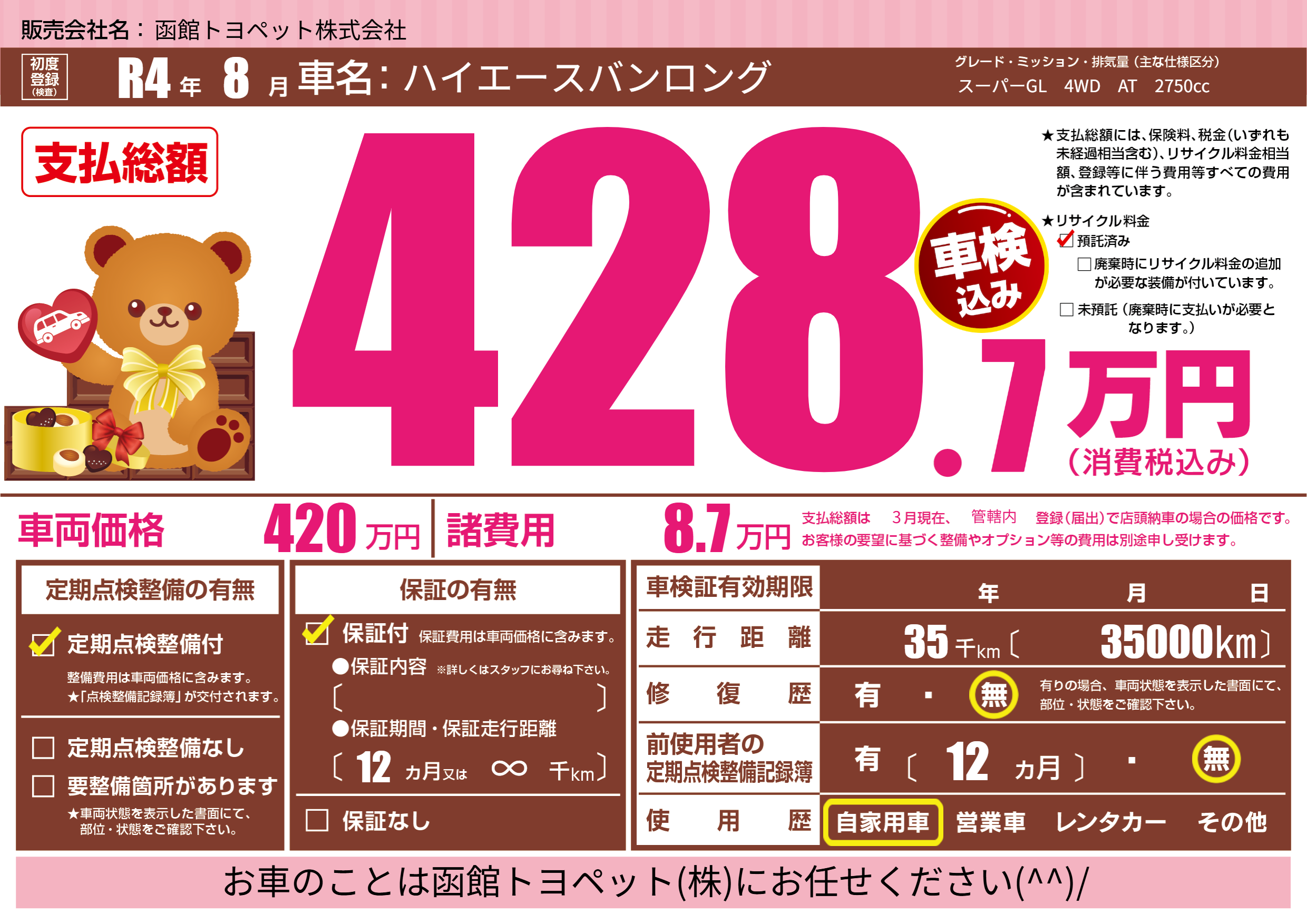 | 車名 | ハイエースバンロング | グレード ミッション 排気量 |