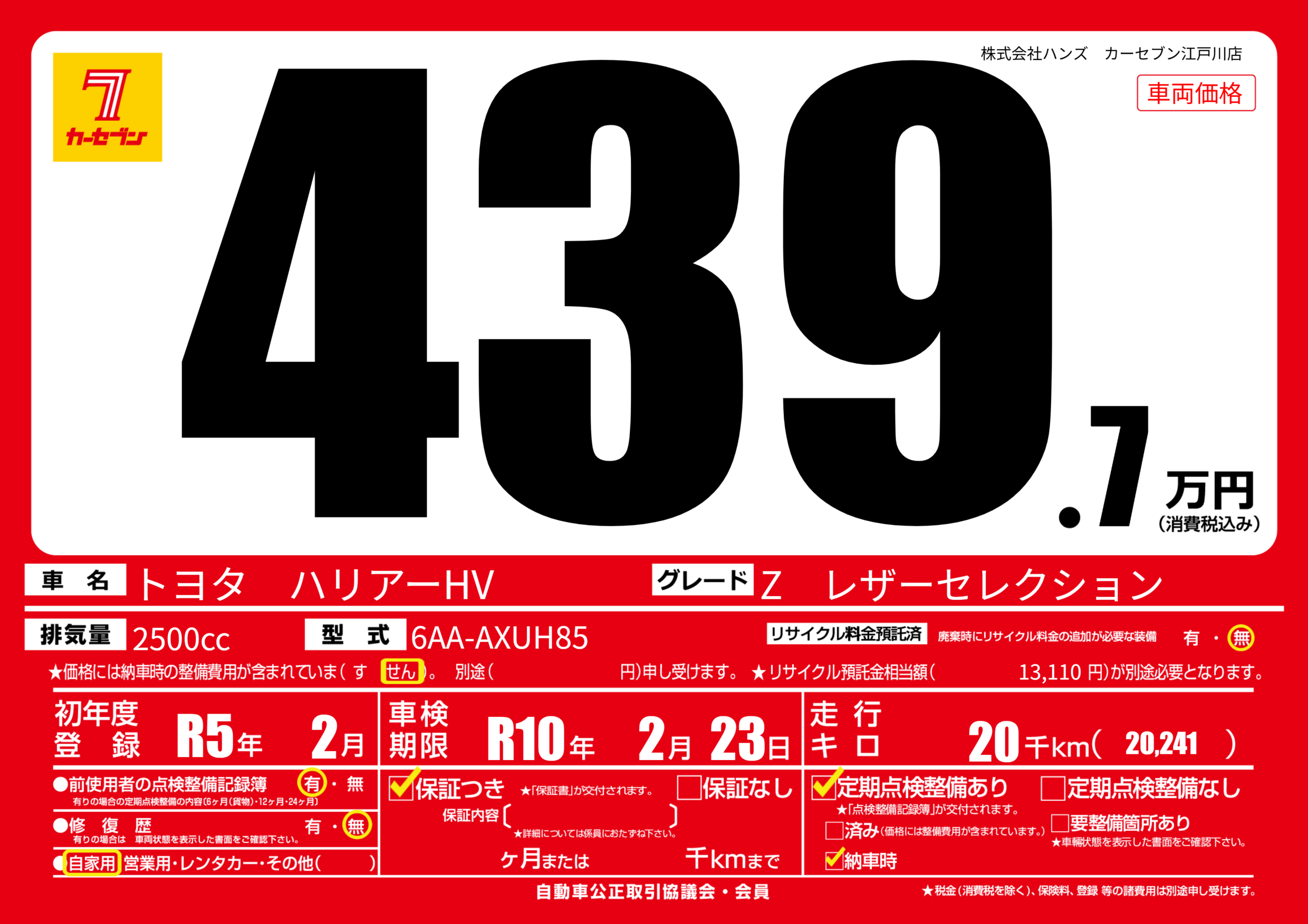 | 車名 | トヨタ ハリアーHV | グレード ミッション 排気量 |