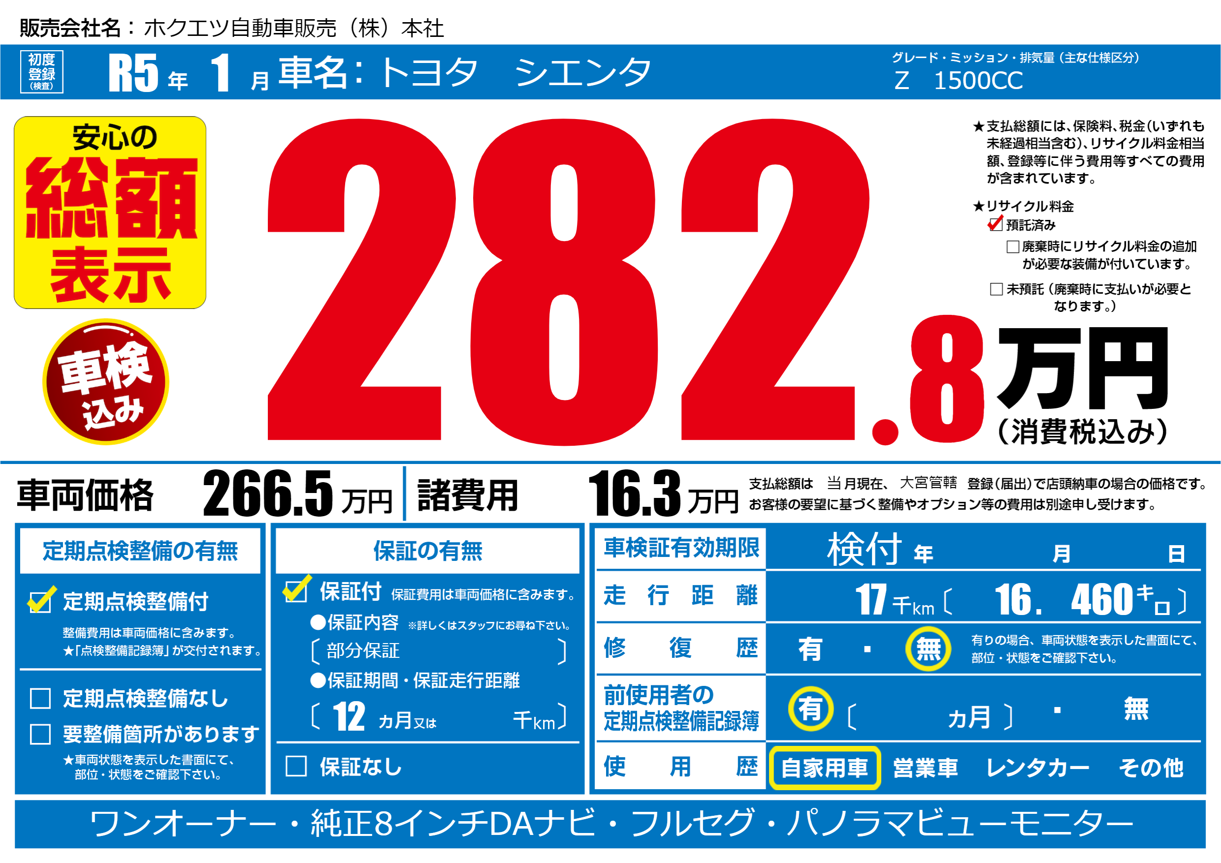 | 車名 | トヨタ シエンタ | グレード ミッション 排気量 |