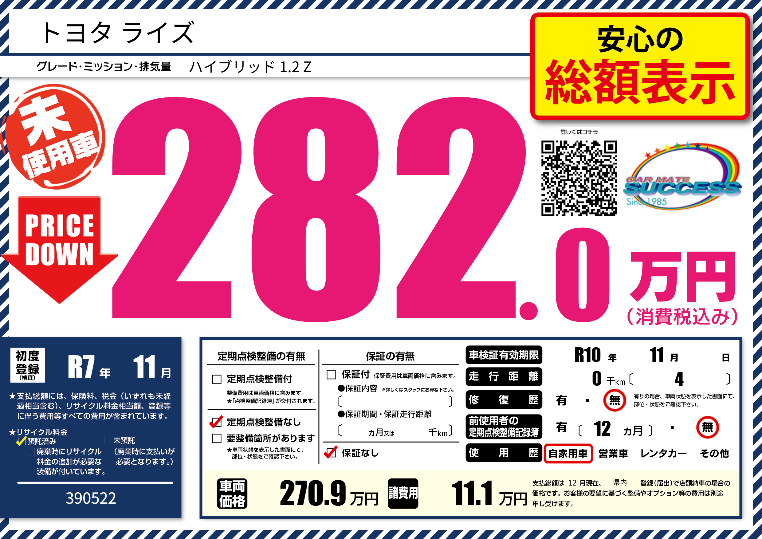 | 車名 | トヨタ ライズ | グレード ミッション 排気量 |