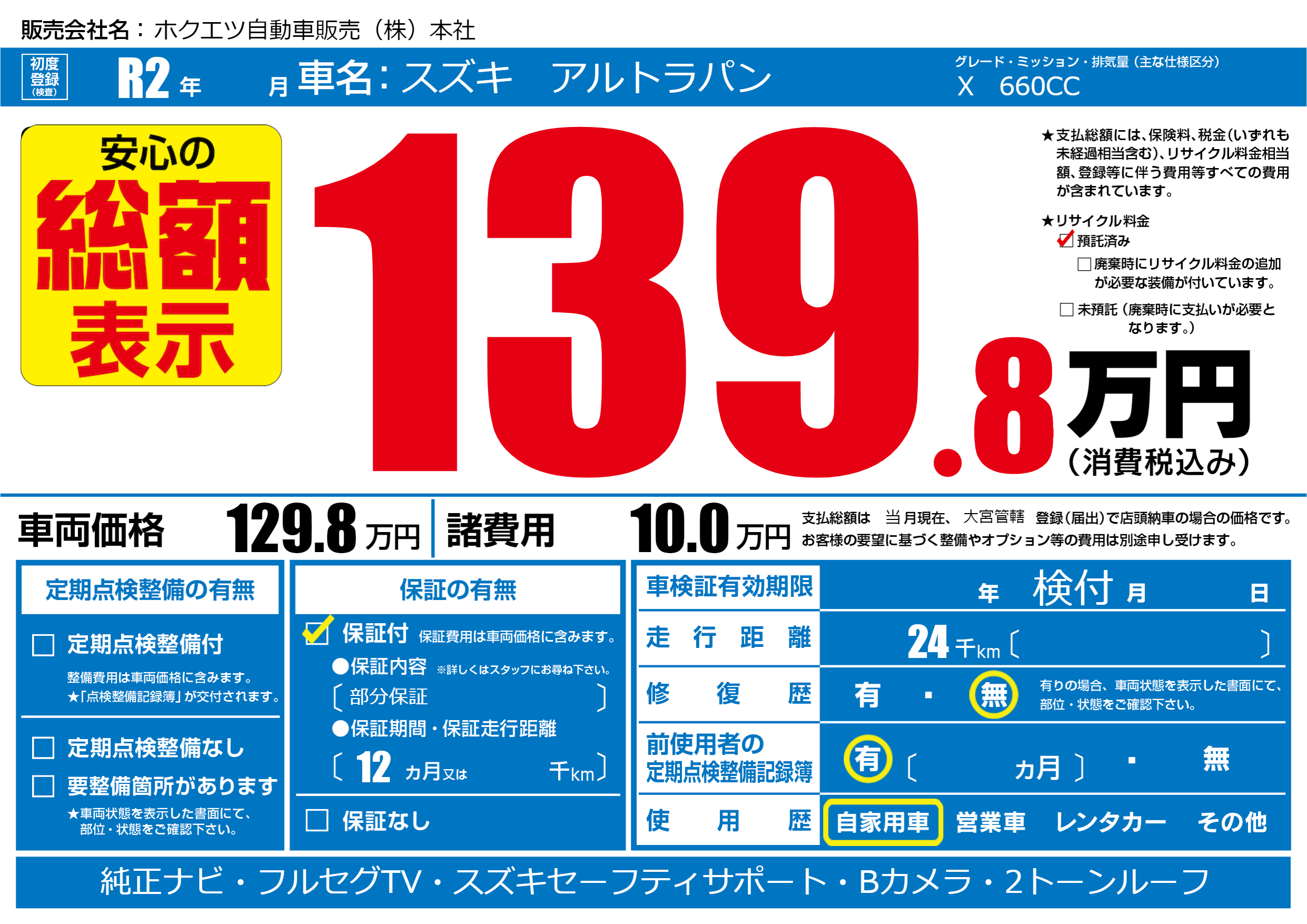 | 走行キロ | 2.4万km | 初年度登録 | R2年---月 |