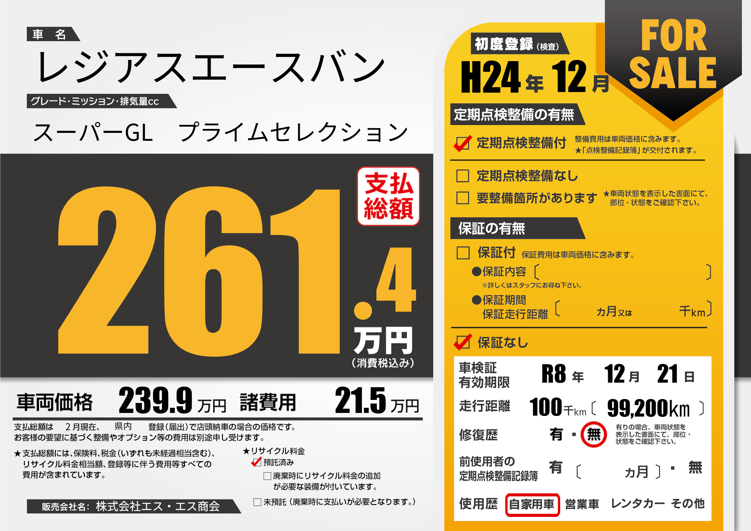 | 走行キロ | 10万km | 初年度登録 | H24年12月 |