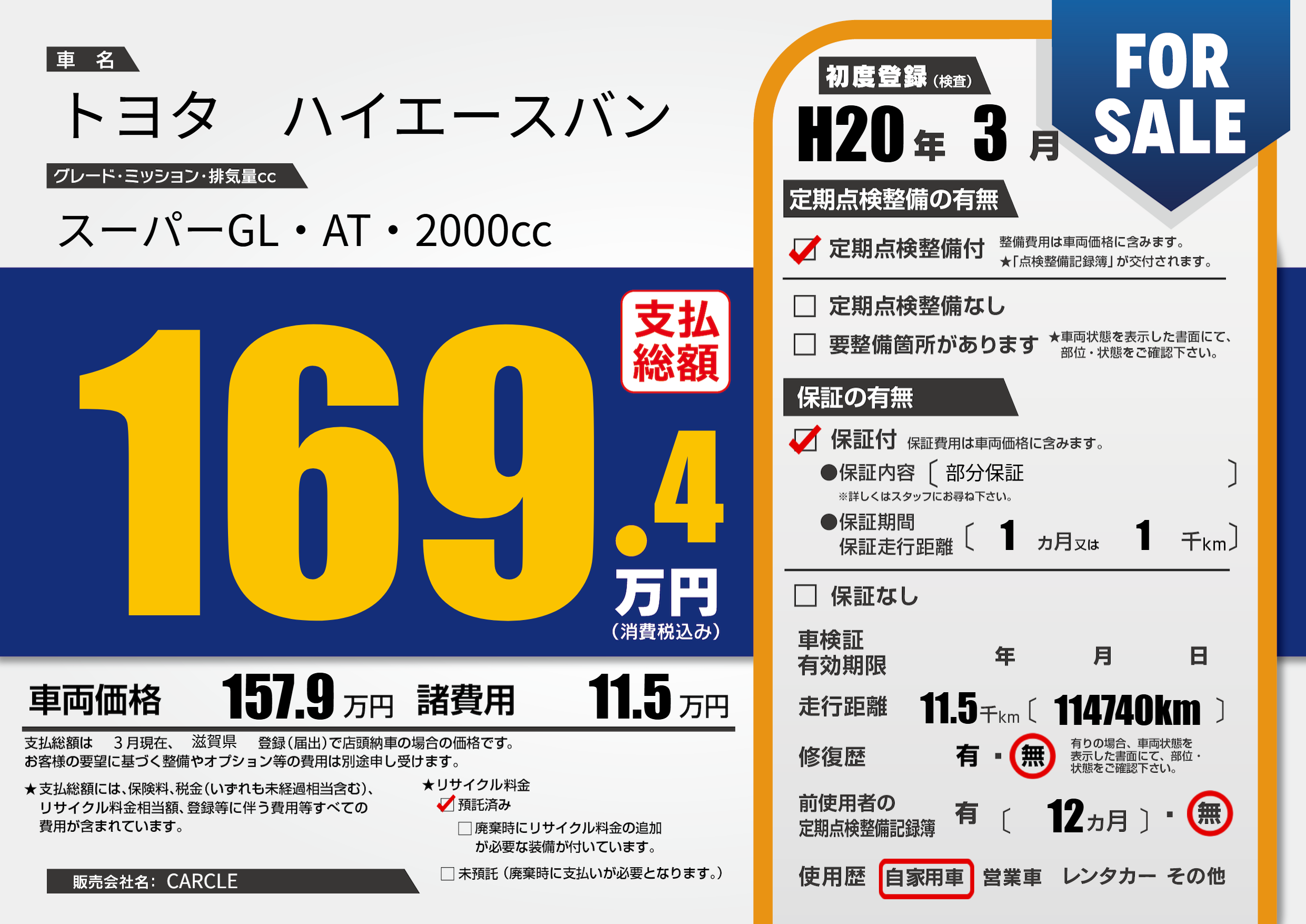 | 車名 | トヨタ ハイエースバン | グレード ミッション 排気量 |