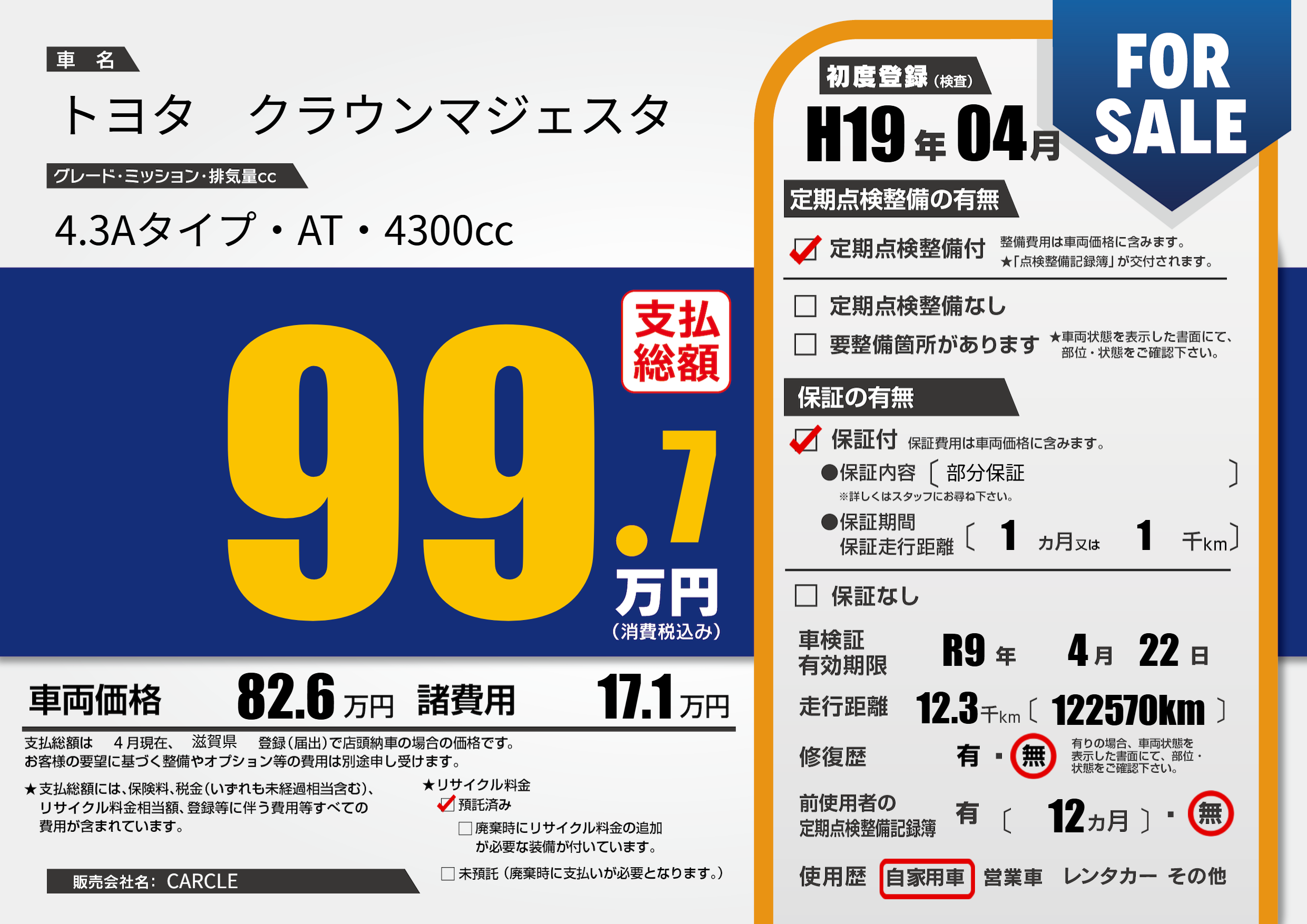 なし | 車検制限 | R9年4月22月 |