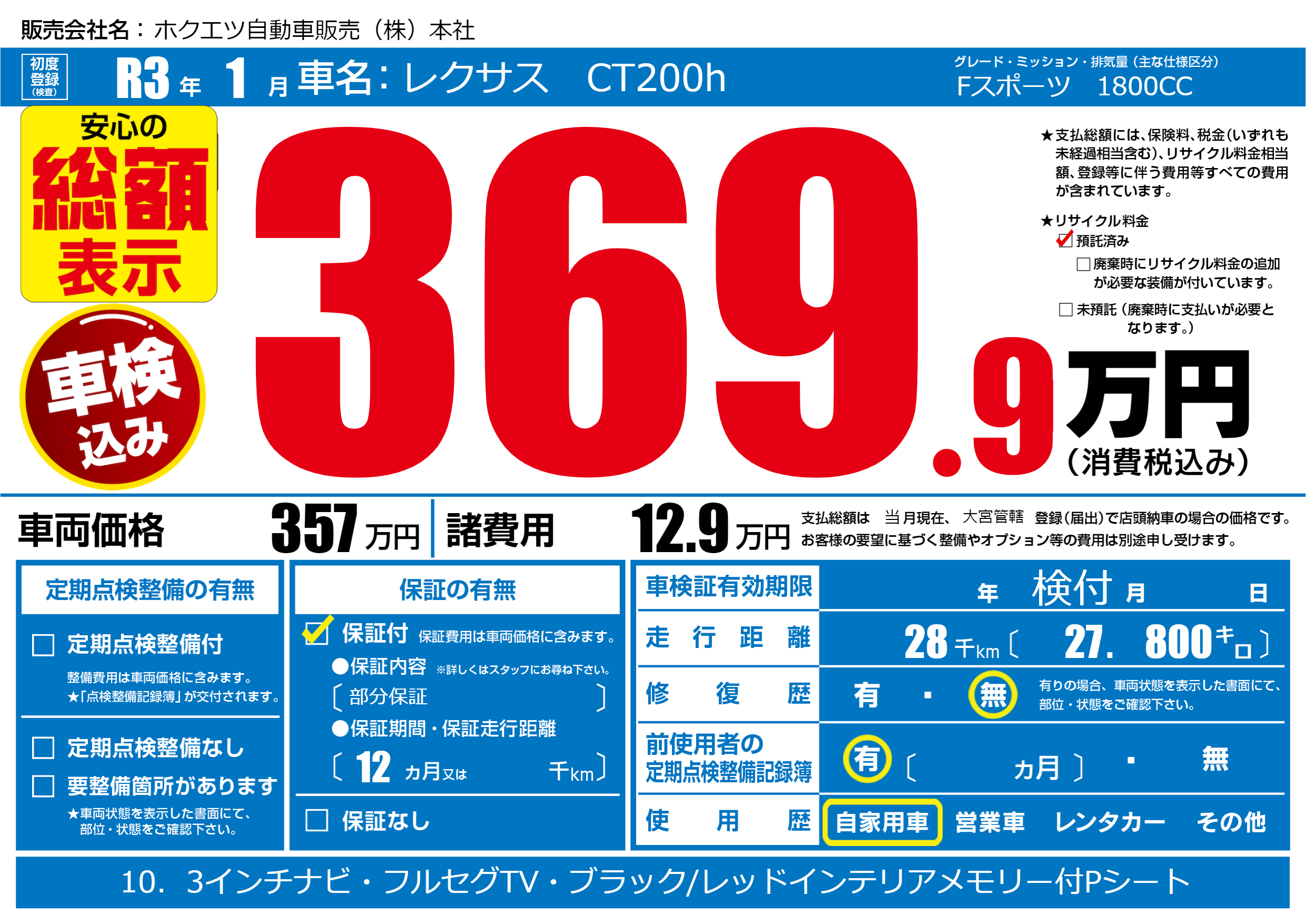 あり | リサイクル預託金相当額 | ( 0円)が別途必要 |