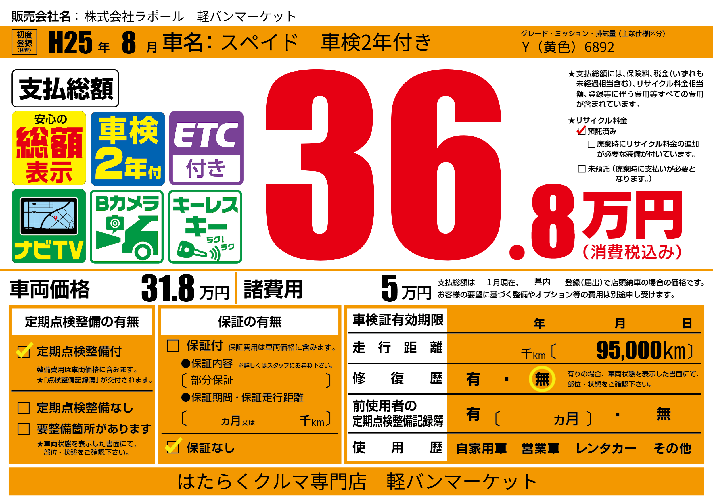 | 走行キロ | - | 初年度登録 | H25年8月 |