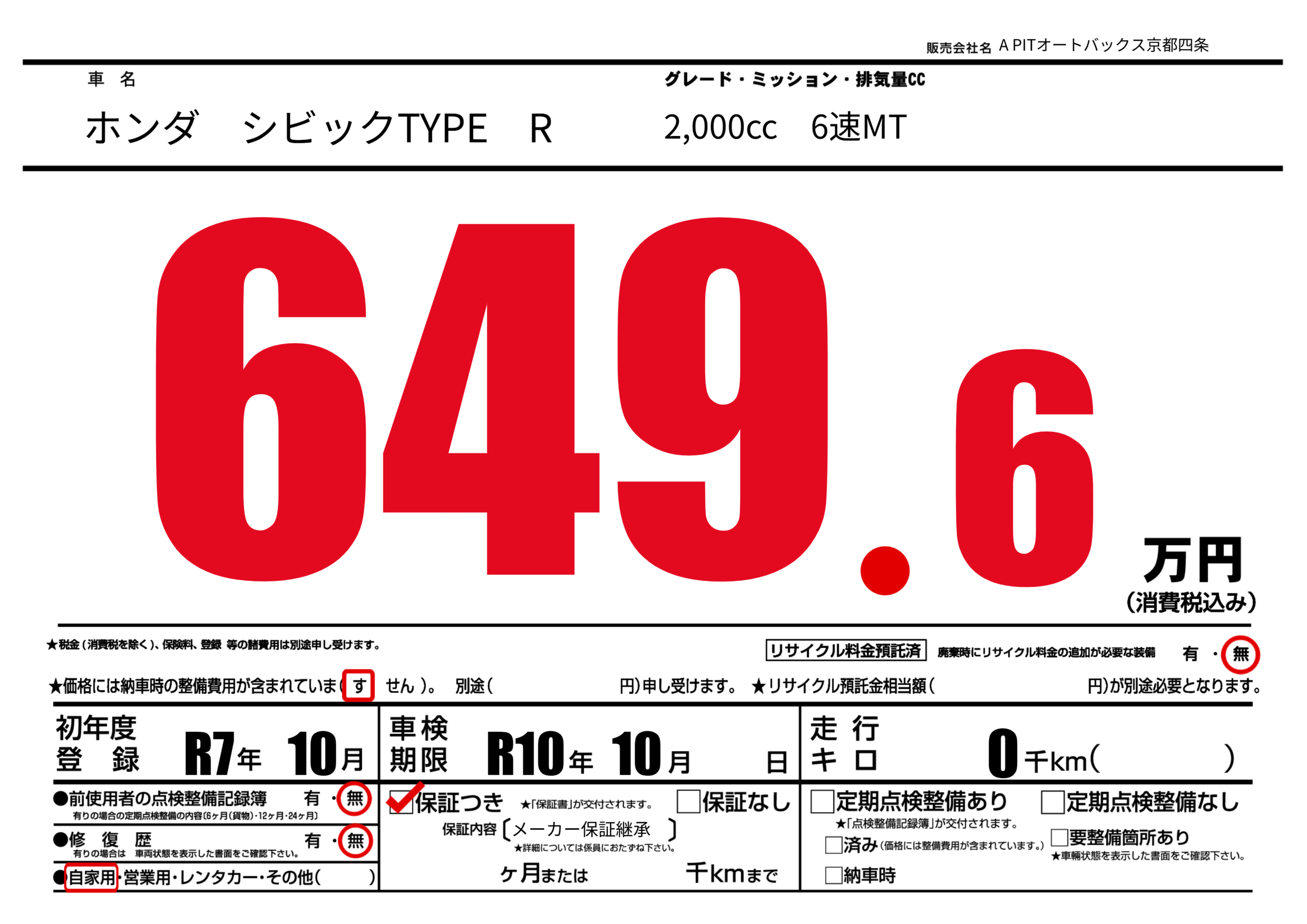 | 車名 | ホンダ シビックTYPE R | グレード ミッション 排気量 |