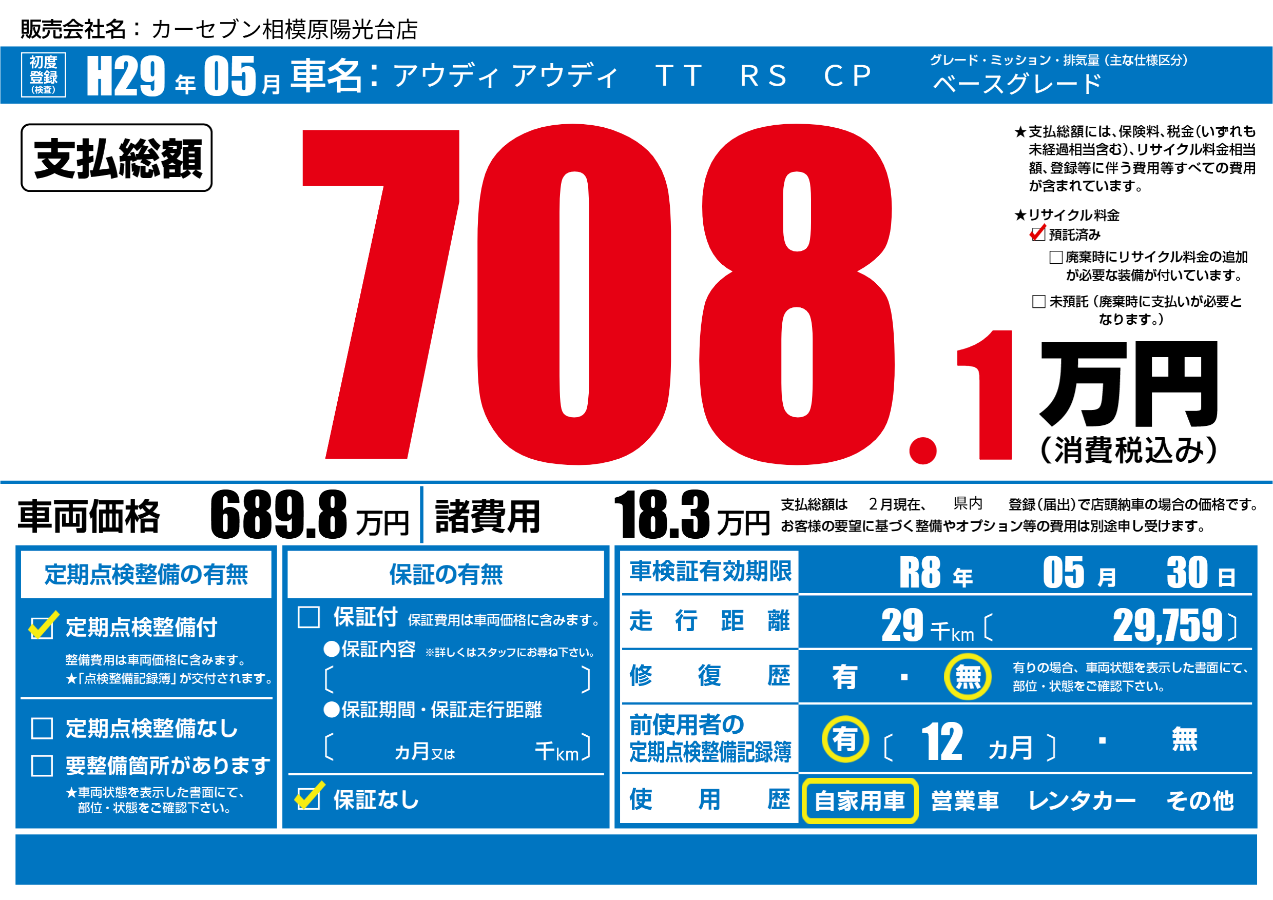 | 車名 | アウディ アウディ TT RS CP | グレード ミッション 排気量 |