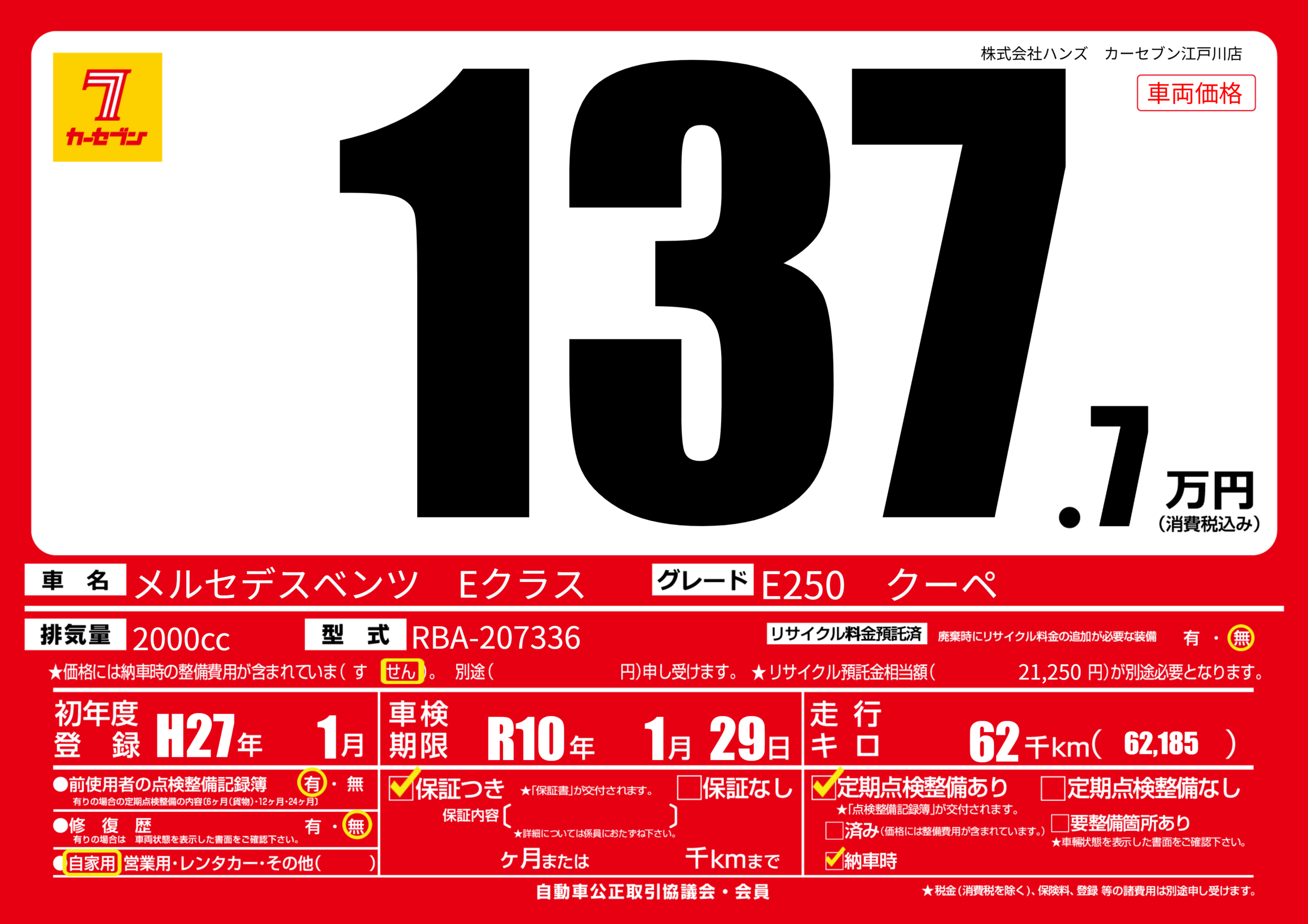 | 車名 | メルセデスベンツ Eクラス | グレード ミッション 排気量 |
