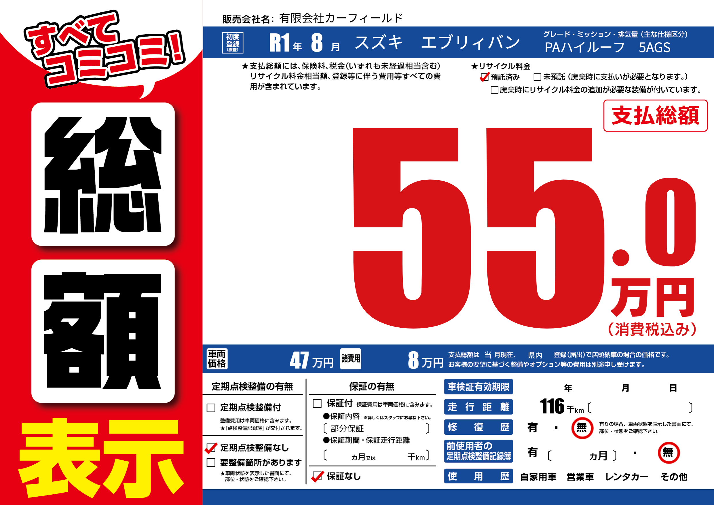 保証なし 保証内容(部分保証) ---ヶ月または()千kmまで |