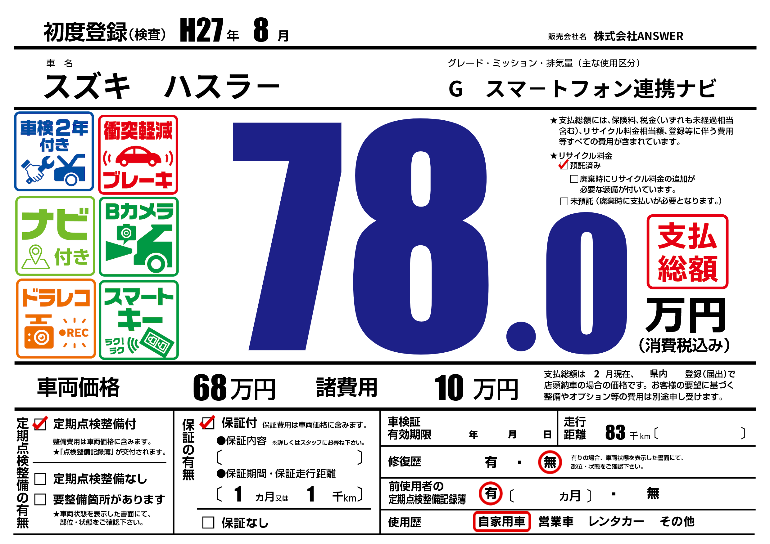 | 走行キロ | 8.3万km | 初年度登録 | H27年8月 |